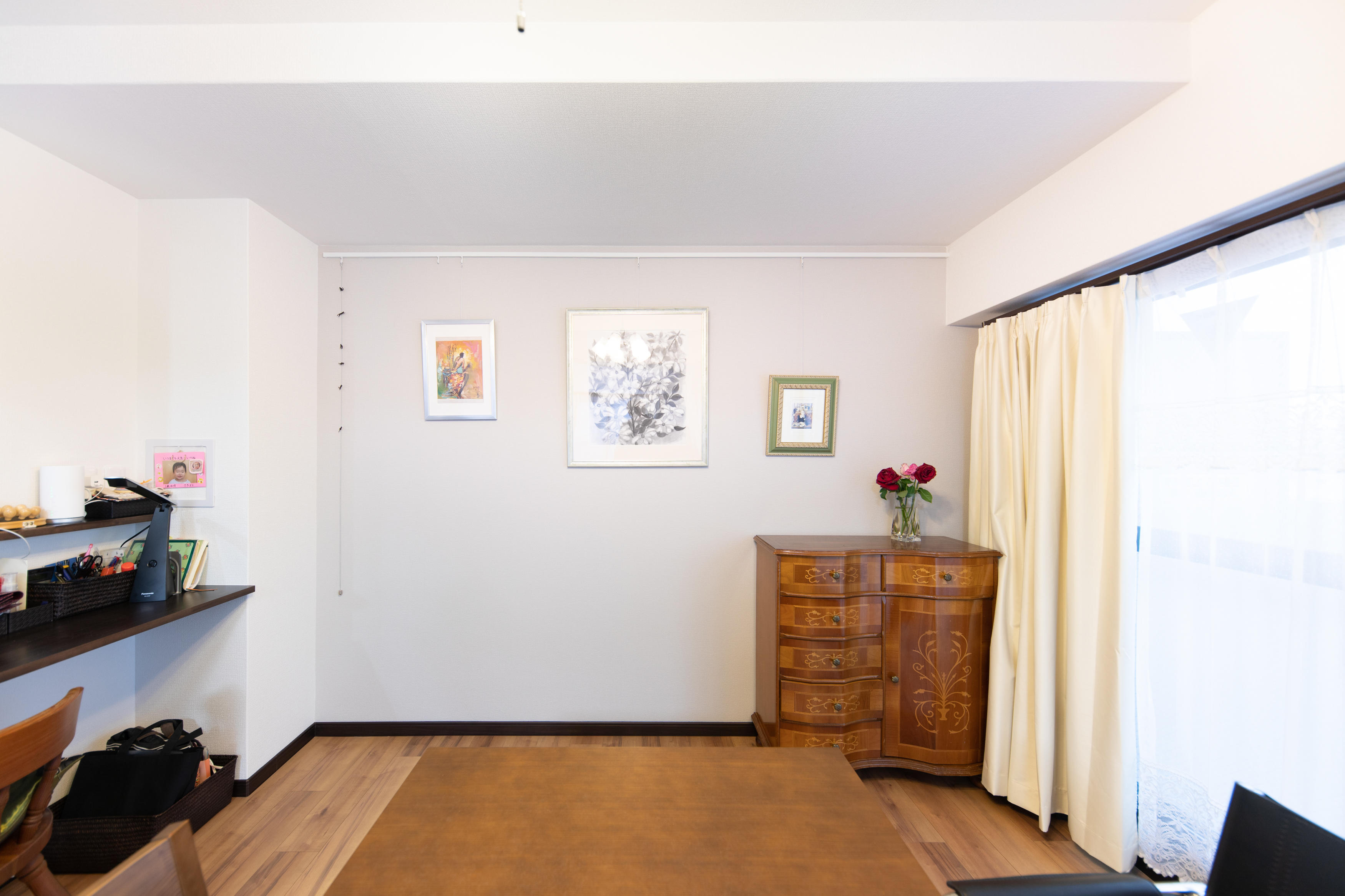 対面キッチン前のカウンターにはライティングダクトレールで好きな位置に照明を取り付けできます。また、ピクチャーレールを設置し絵画を変える事でお部屋の模様替えも楽しめます。「TOSO プクチャーレール / LIXIL ラシッサS」