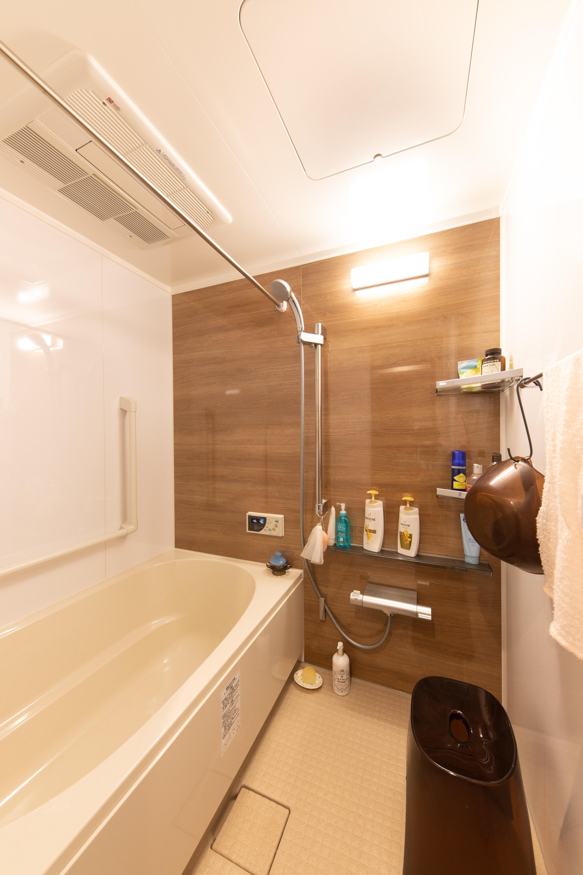 現状の浴室乾燥暖房機を再利用しました。木目のアクセントパネルはドアやフローリングと色味を揃えて統一感があります。「LIXIL リノビオV 1216サイズ」