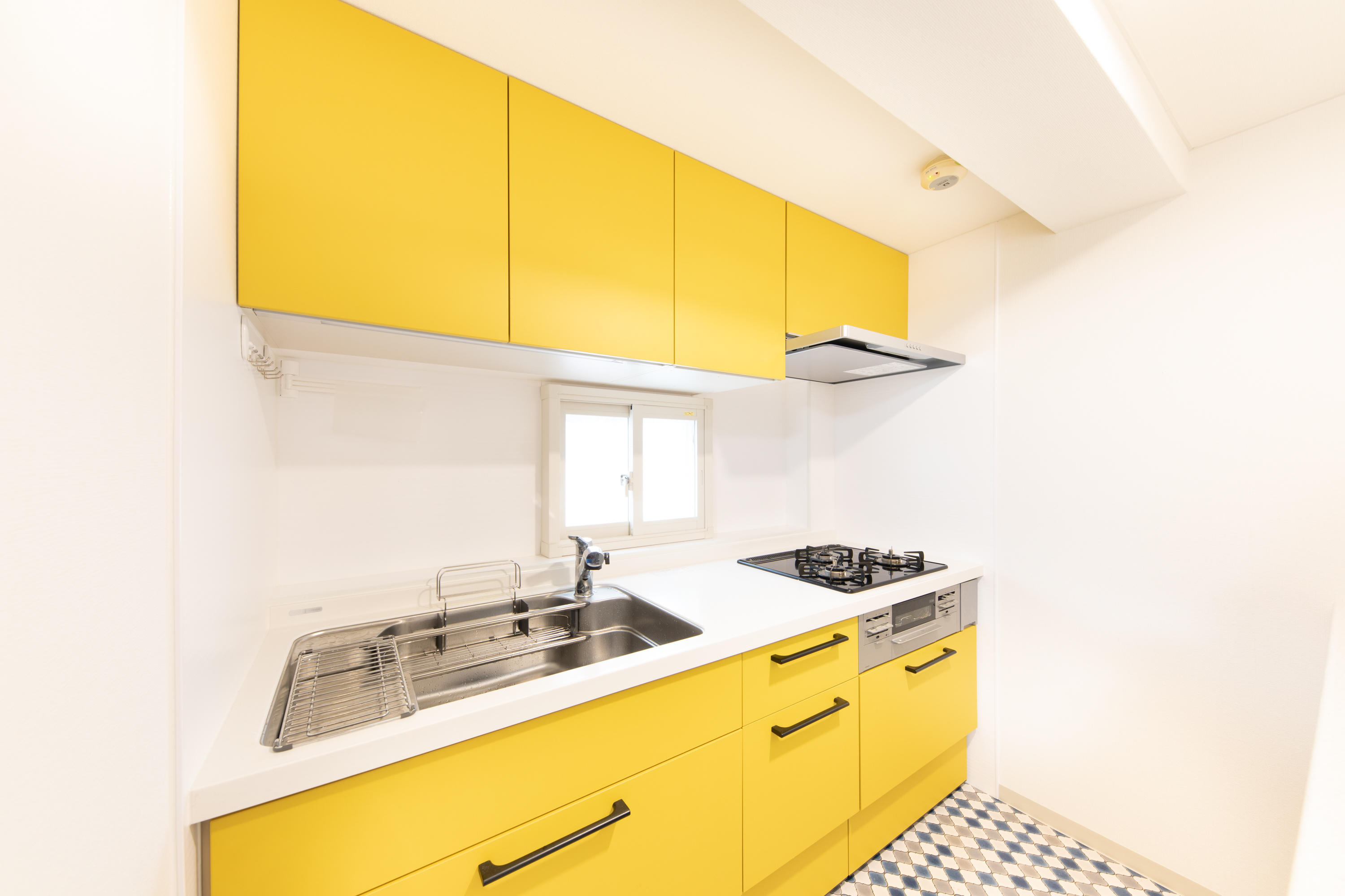 調理台を広く使えるように、Wサポートシンクを採用。シンクを調理台としても使えるため、コンパクトキッチンながら、ストレスなく調理でき、お客様にもご満足いただけました。床のブルー×ベージュのタイル柄はキッチンのイエローを引き立てています。「LIXIL アレスタ I型2100 Wサポートシンク、ダウンウォール」