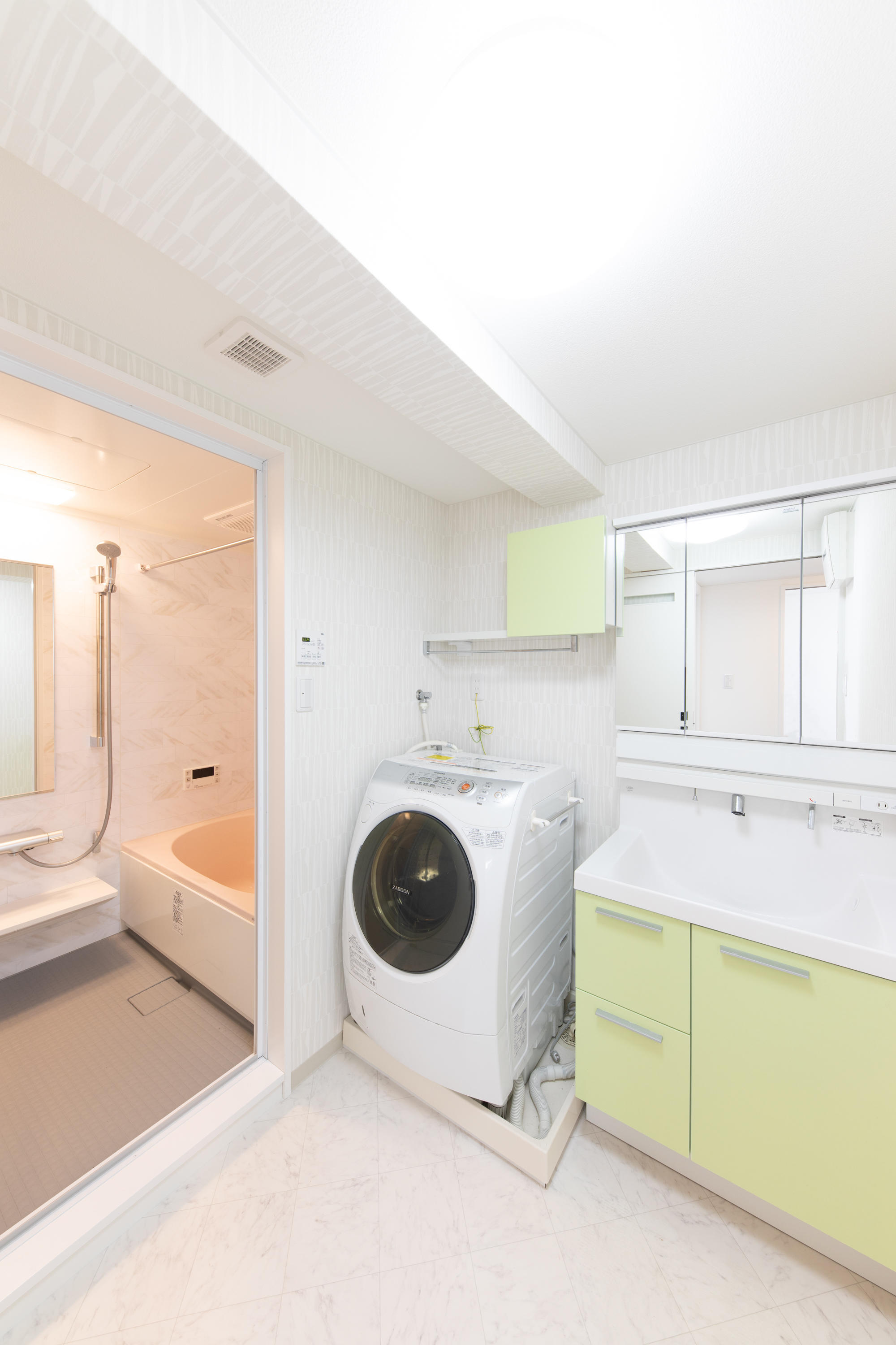 タオルや小物が収納できるように洗濯機上にも収納を設置しました。グリーンと床の大理石調の柄で爽やかで清潔感のある空間に。「LIXIL エルシィ」