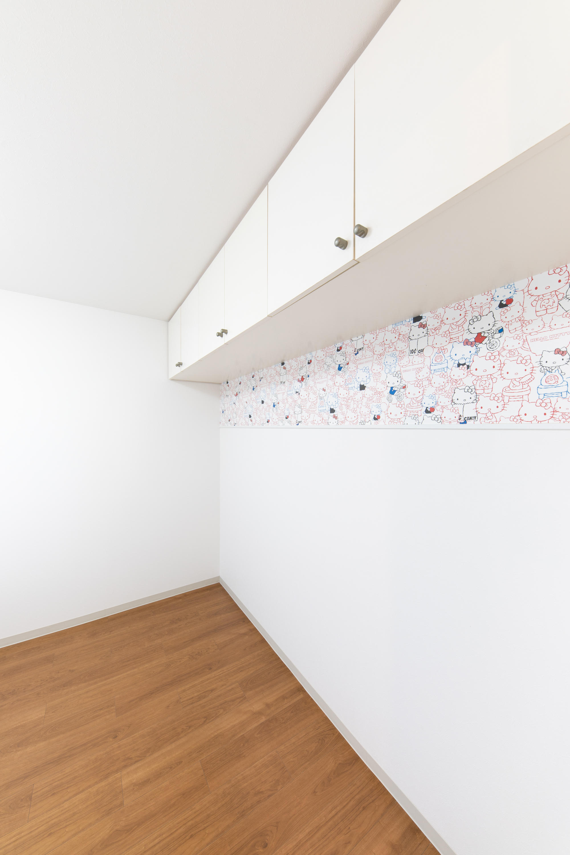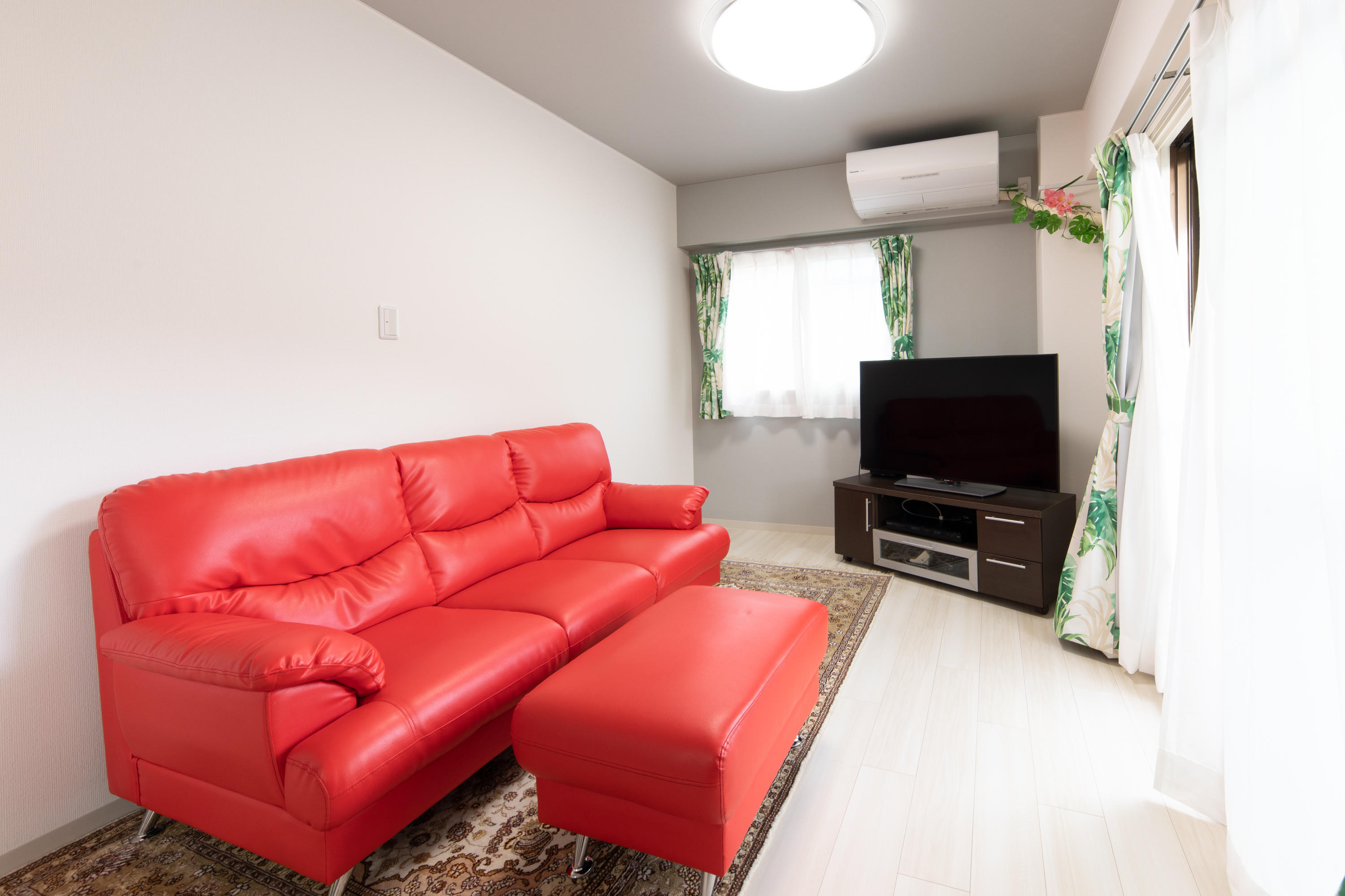 カーペット貼りだったリビングは白・グレーでまとめて、赤いソファーを引き立てます。