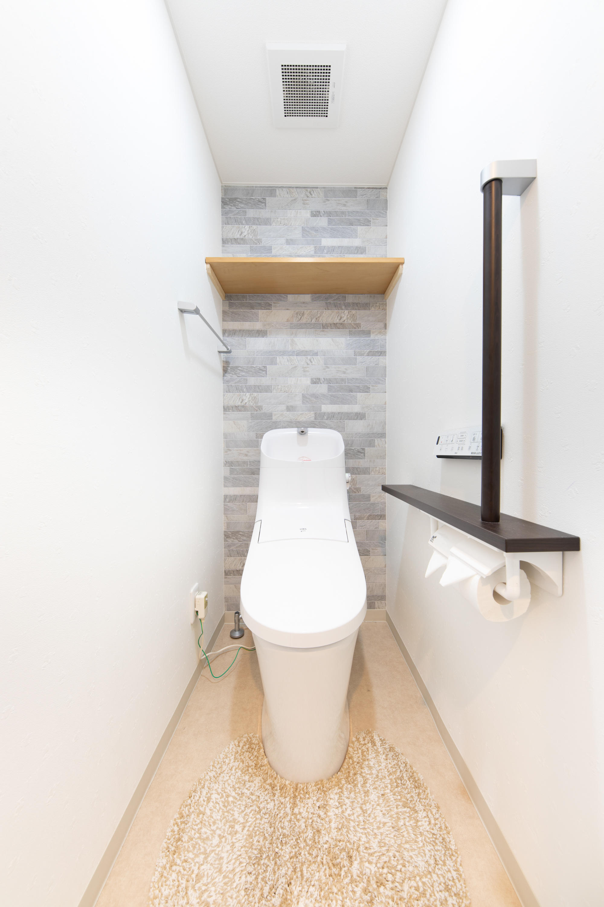 一体型のトイレは継ぎ目が少なくお手入れ簡単です。両サイドのクロス…よーく見ると実はキティちゃんの柄なんです!キティちゃん好きの奥様のために。「LIXIL アメージュ」