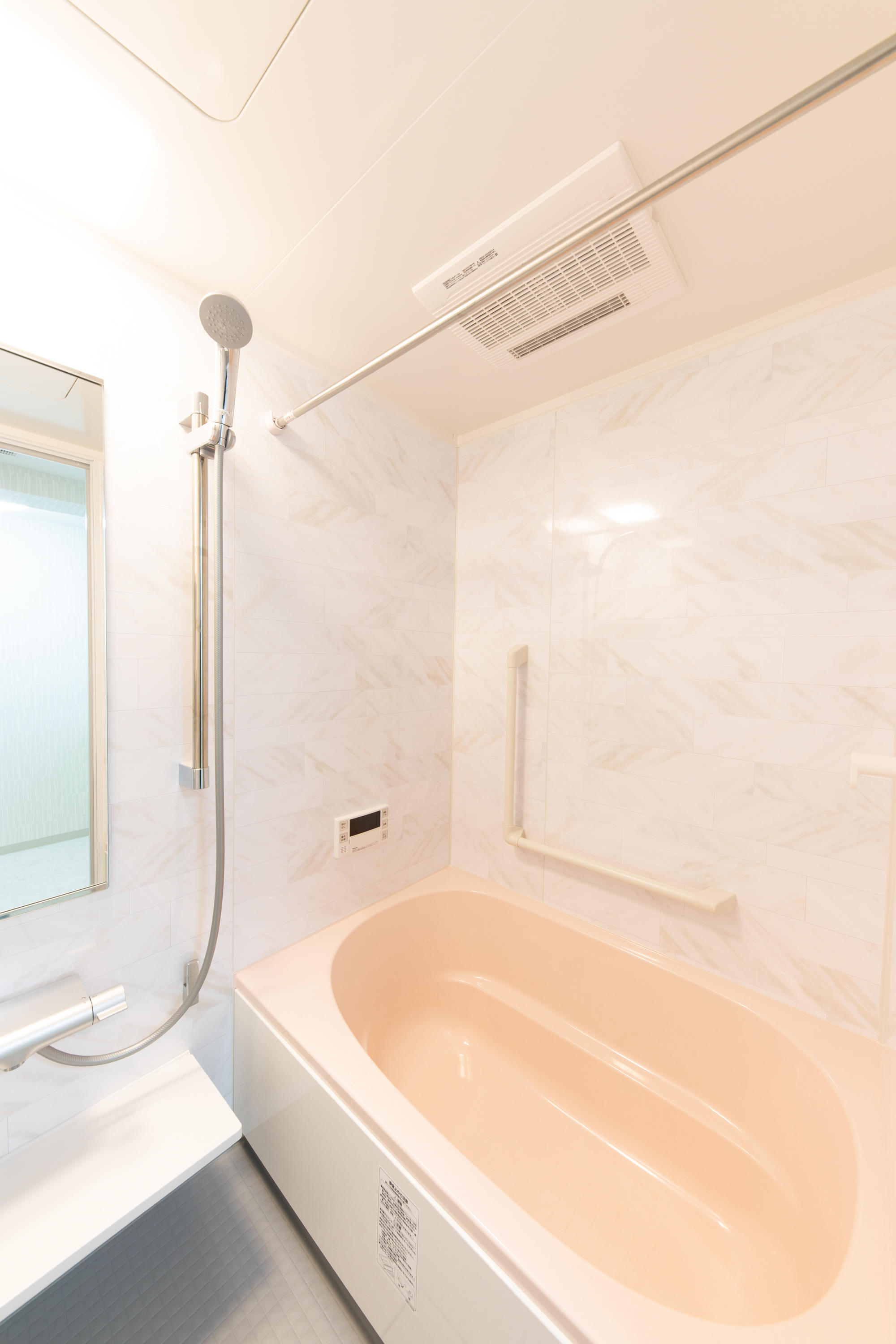 お手入れがしやすくなり、浴室乾燥暖房機付きで温かいお風呂に。ピンクの浴槽で気持ちが和らぎます。「LIXIL リノビオV 浴室暖房乾燥機」