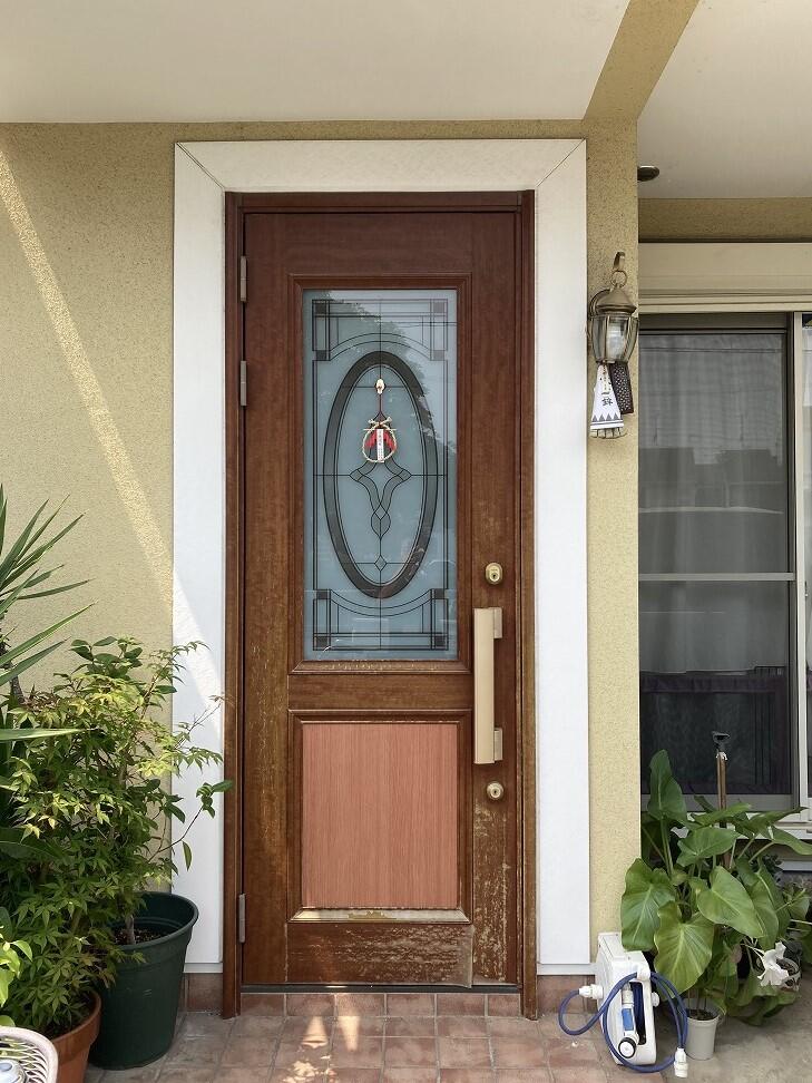 玄関扉の開口寸法を、狭めずに取り替えたいとのご要望でした。扉の枠はそのままで、扉のみを交換させていただきました。