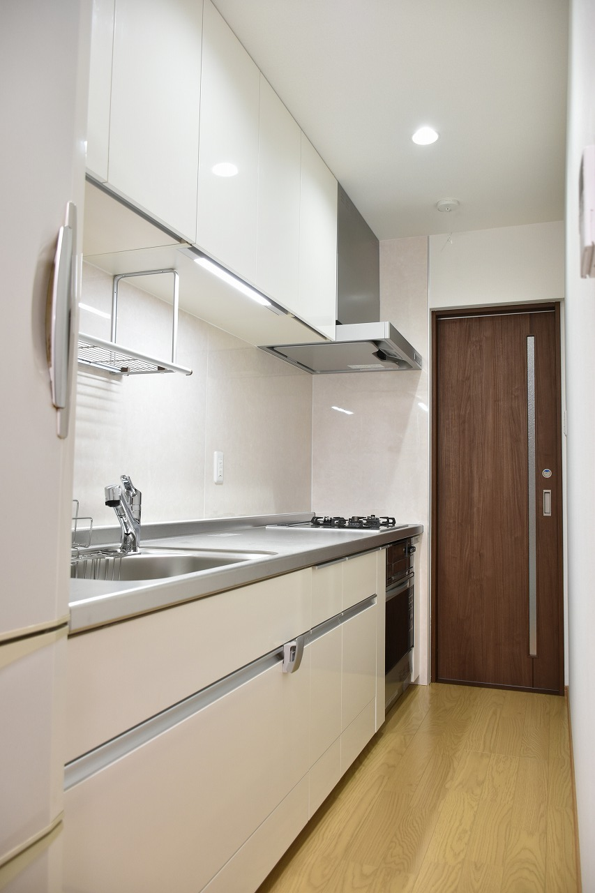 以前は裏へ行く廊下に面した流し台タイプのキッチンでしたが、今回60センチ奥行のシステムキッチンに変更しました。奥様がシンクに立たれても後ろを人が通れるスペースを確保しました。