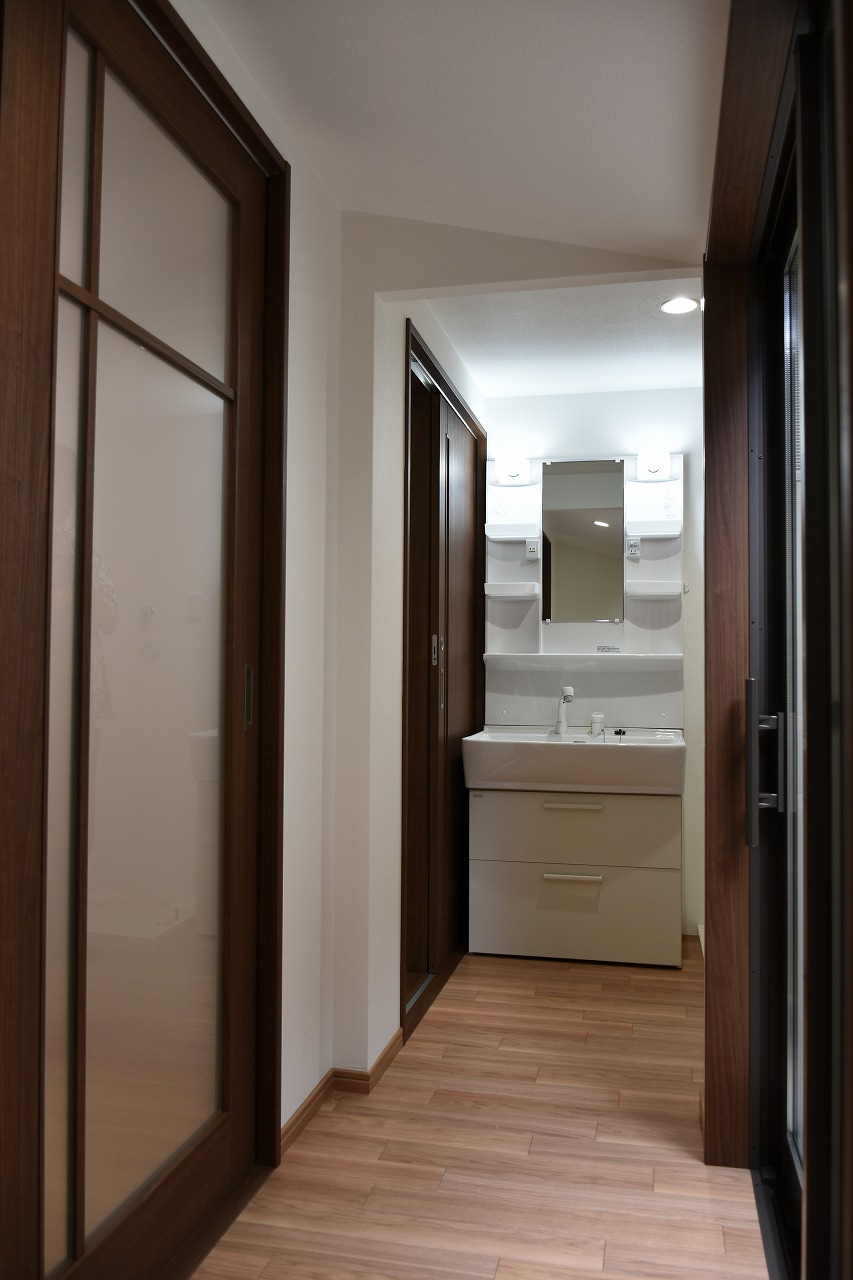 今までは裏庭の半外部分に洗面所がありましたが、今回洗面脱衣室としてユニットバスに隣接し、洗面脱衣、そして洗濯機も取り込んだユーティリティスペースに生まれかわりました。