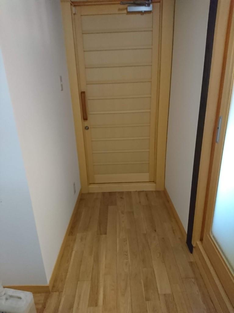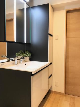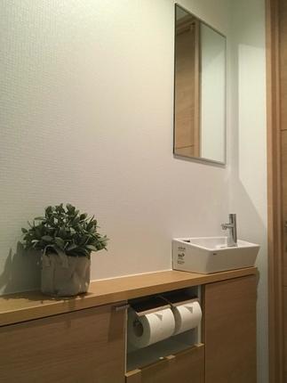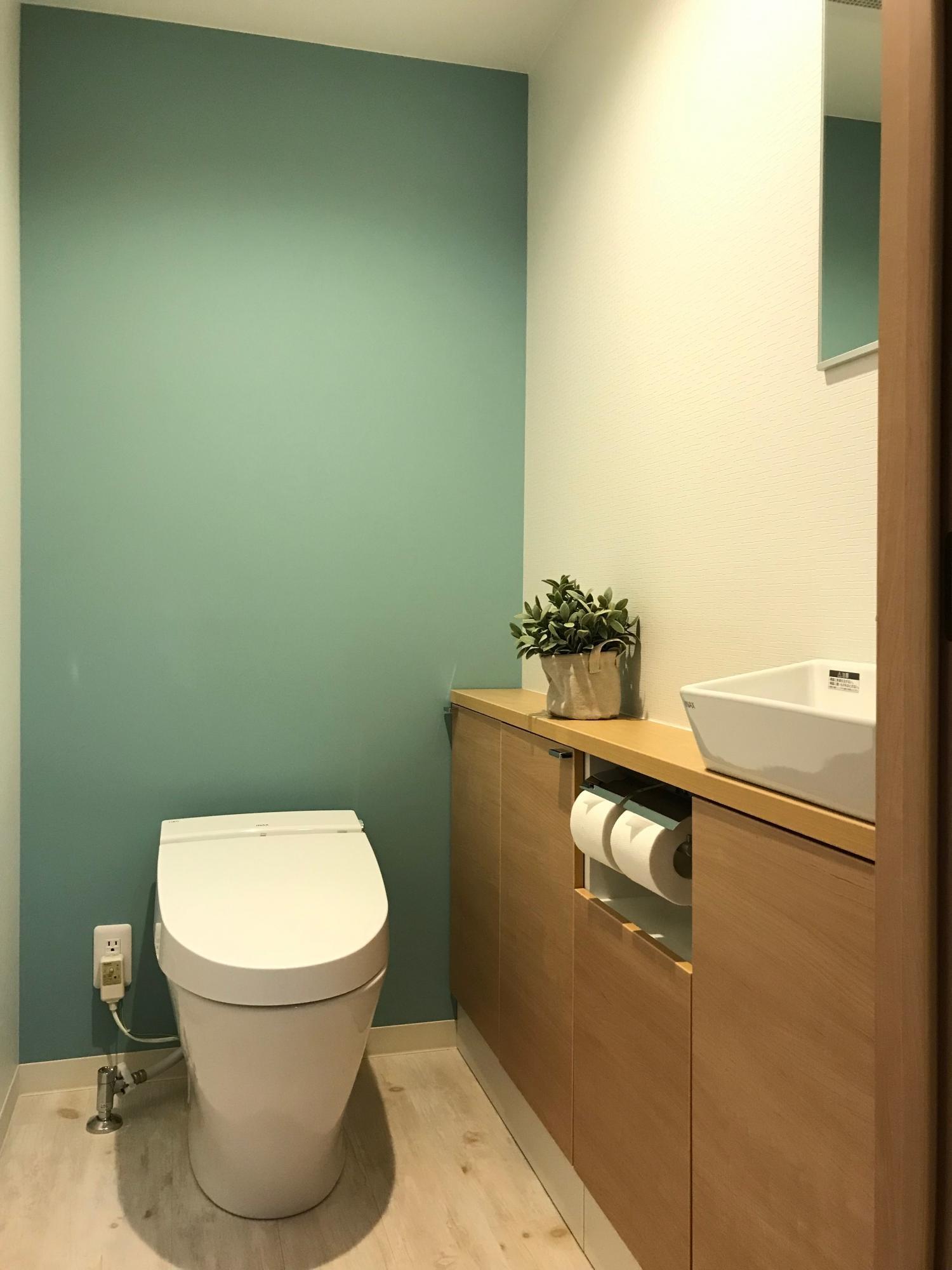 将来、お子様が誕生される考慮してサティスSで収納力もあるキャパシアを提案。お客さまのご要望で手洗い前にミラーも設置しました。 内装のクロスは若奥様のお好きなカラーを背面にアクセントとして使用しました。