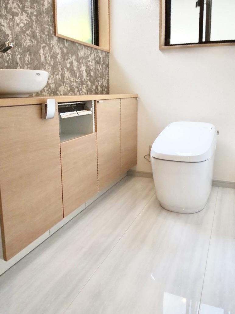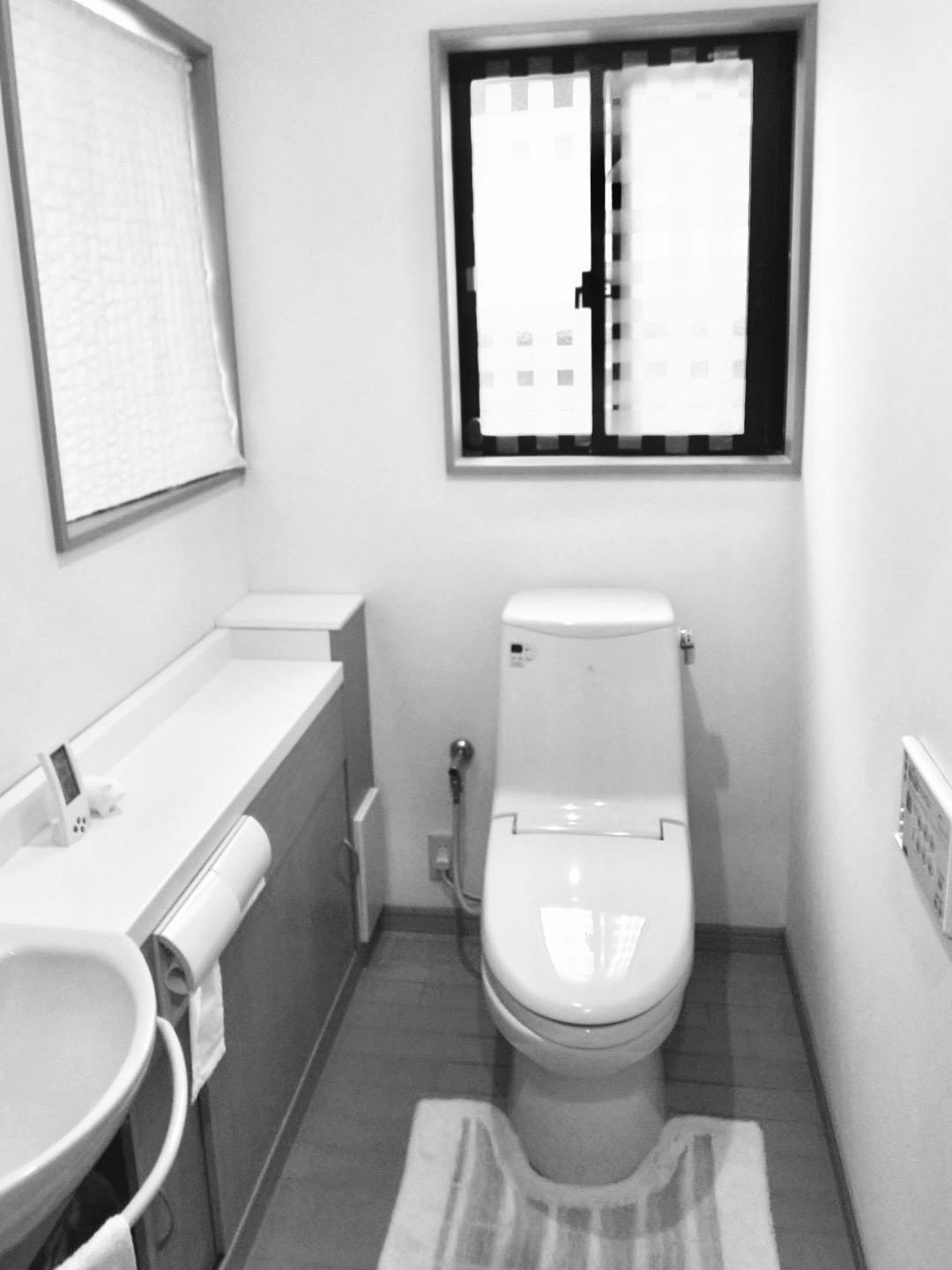玄関のドアを開けるとお香の香りが漂ってくる、和モダンの住まいにあるトイレのリフォーム。 1階のトイレはゆったりとした広めの空間で、2階のトイレは一般的な広さです。それぞれのスペースの特性を生かしながら、和モダンの佇まいに即した、清潔で便利なトイレを心掛けました。 既存の床はフローリングだったので、掃除の面で少し難がありお困りでしたが、抗菌・抗ウイルス・防臭効果のあるセラミックの床材を提案したところ、たいへん満足していただけました。