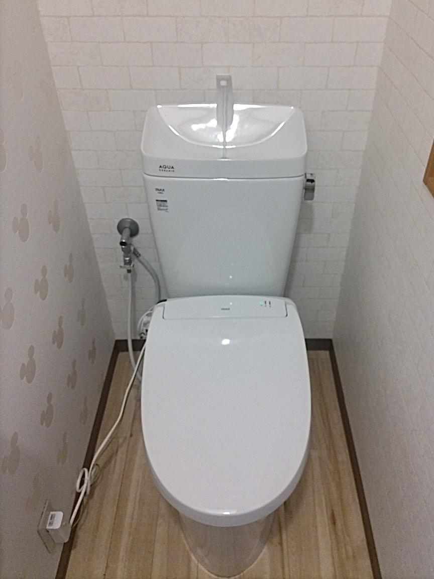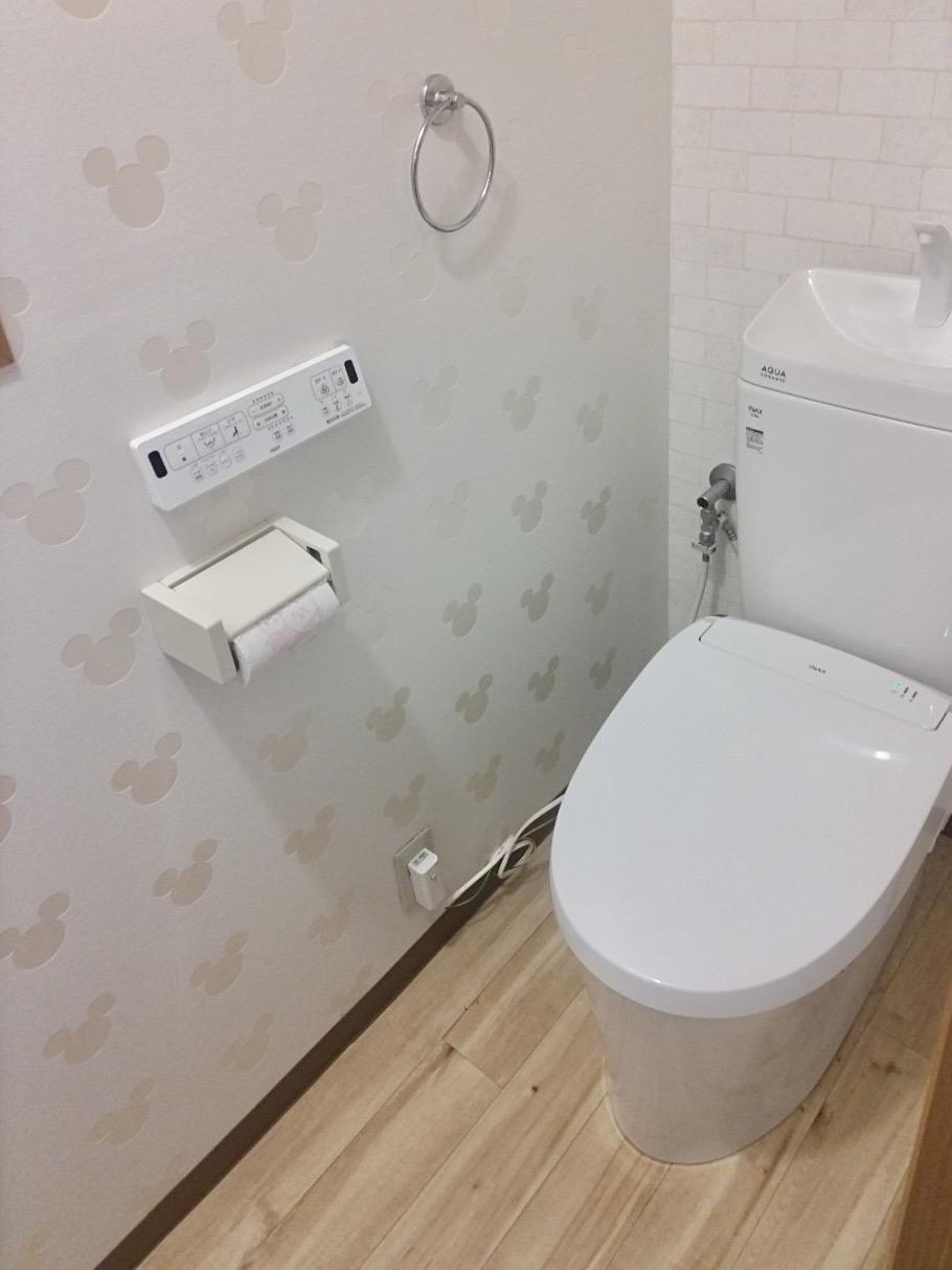 1日で工事が終わりました。かわいらしいトイレにしたかったのでこのクロスにさせていただきました。 希望通りになり満足しています。子供達には楽しいトイレになると思います。 従業員の皆様ありがとうございました。