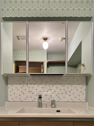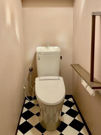 トイレ空間は、ハーレクイン・パターンのように斜め張りしたCFに、淡いカラークロスをコーディネートし海外インテリアを思わせるような仕上がりに。毎日使う場所だからこそ、居心地のよさとデザイン性の両立を大切にしました。