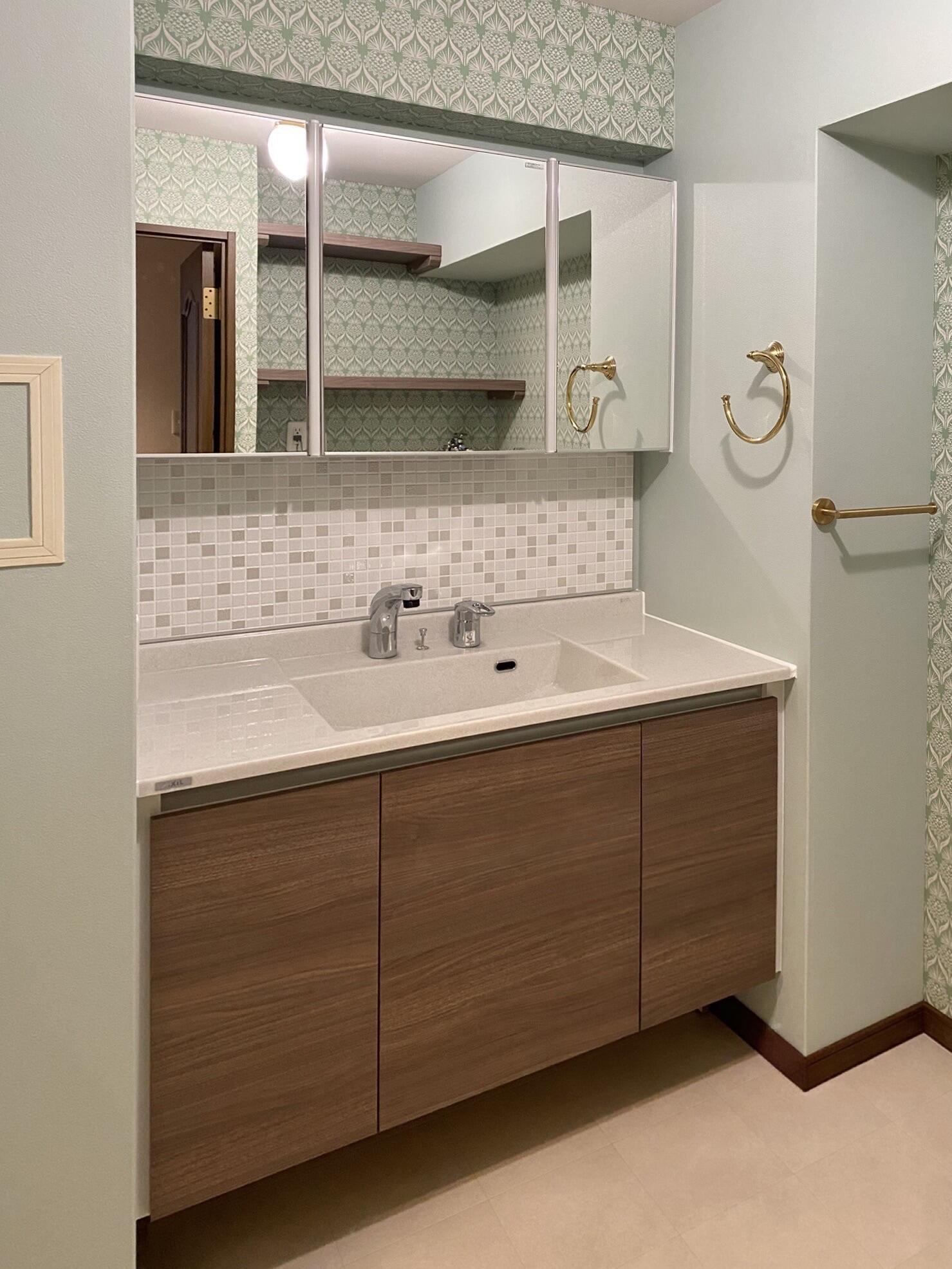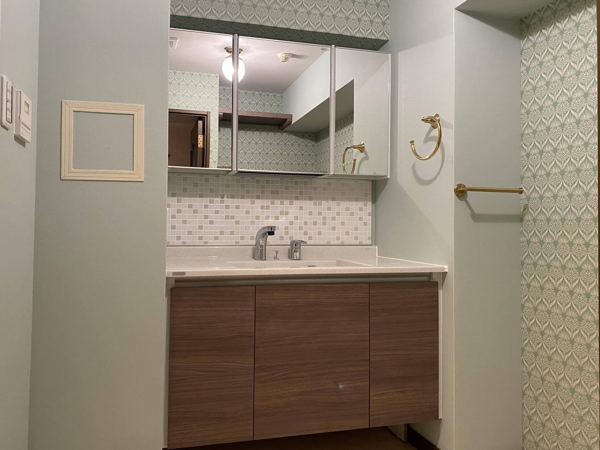 お施主様支給の輸入クロスと真鍮のタオルハンガー、上質な空気感と素材感を活かした統一感のある洗面空間に仕上げました。