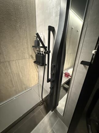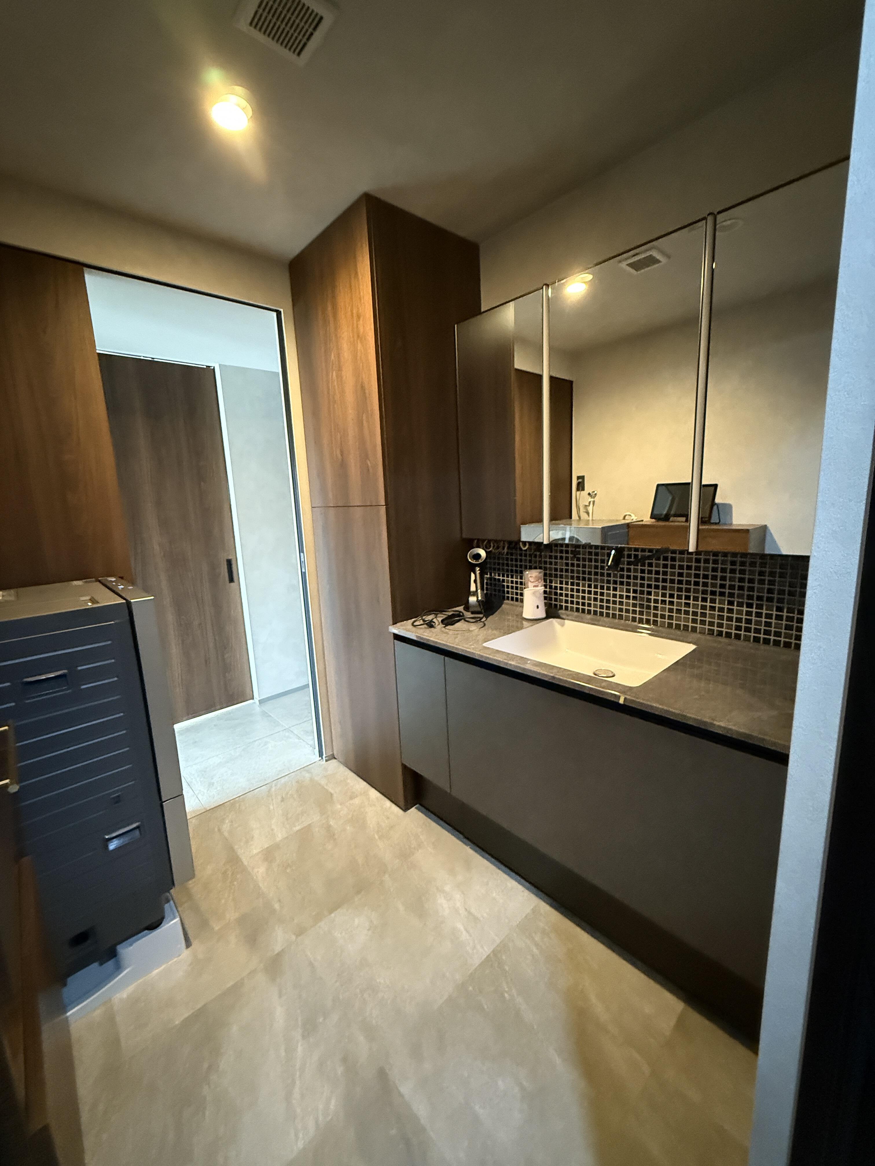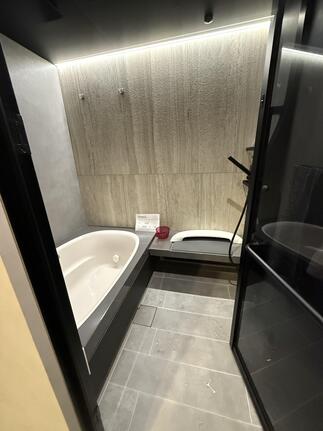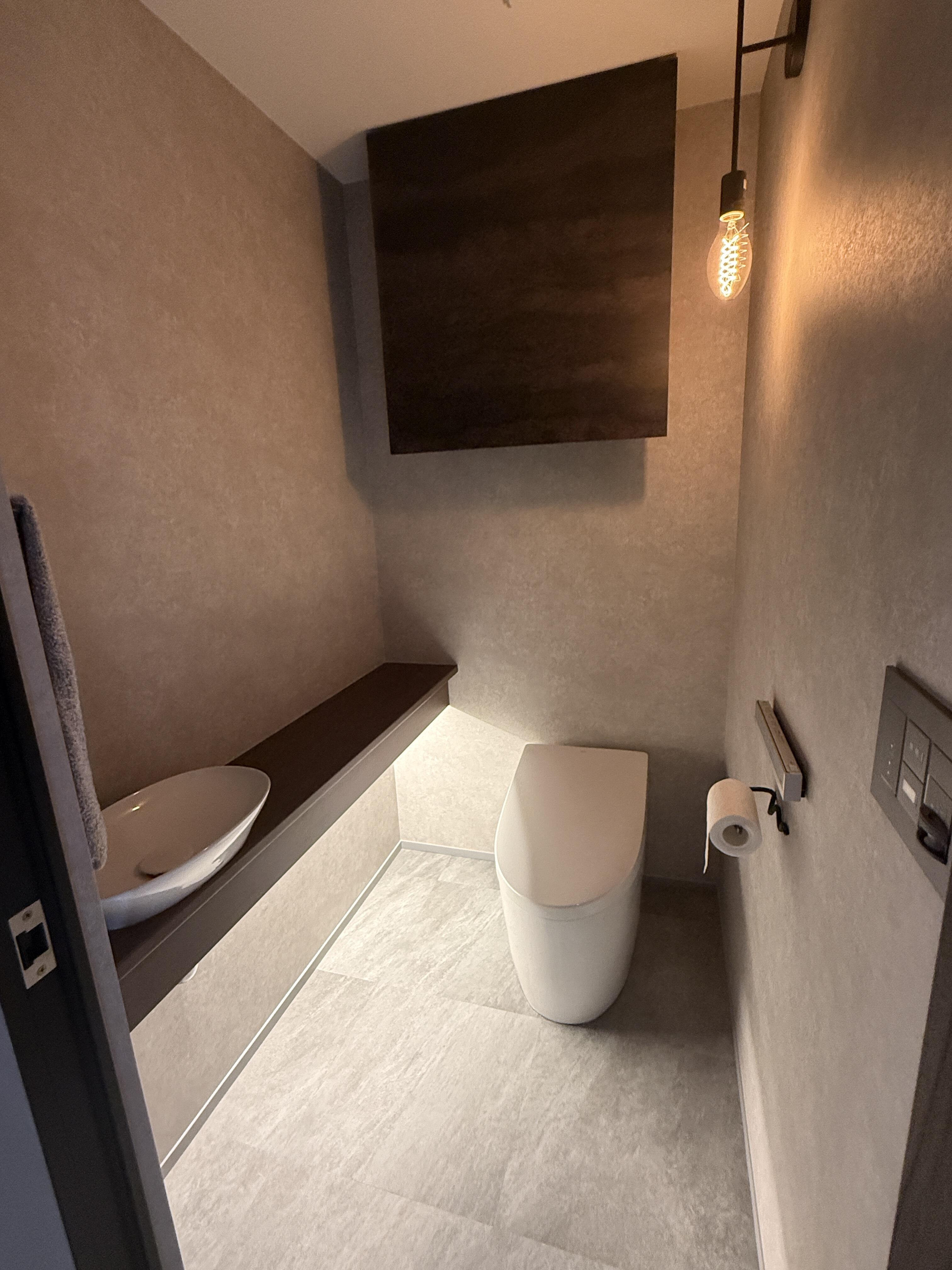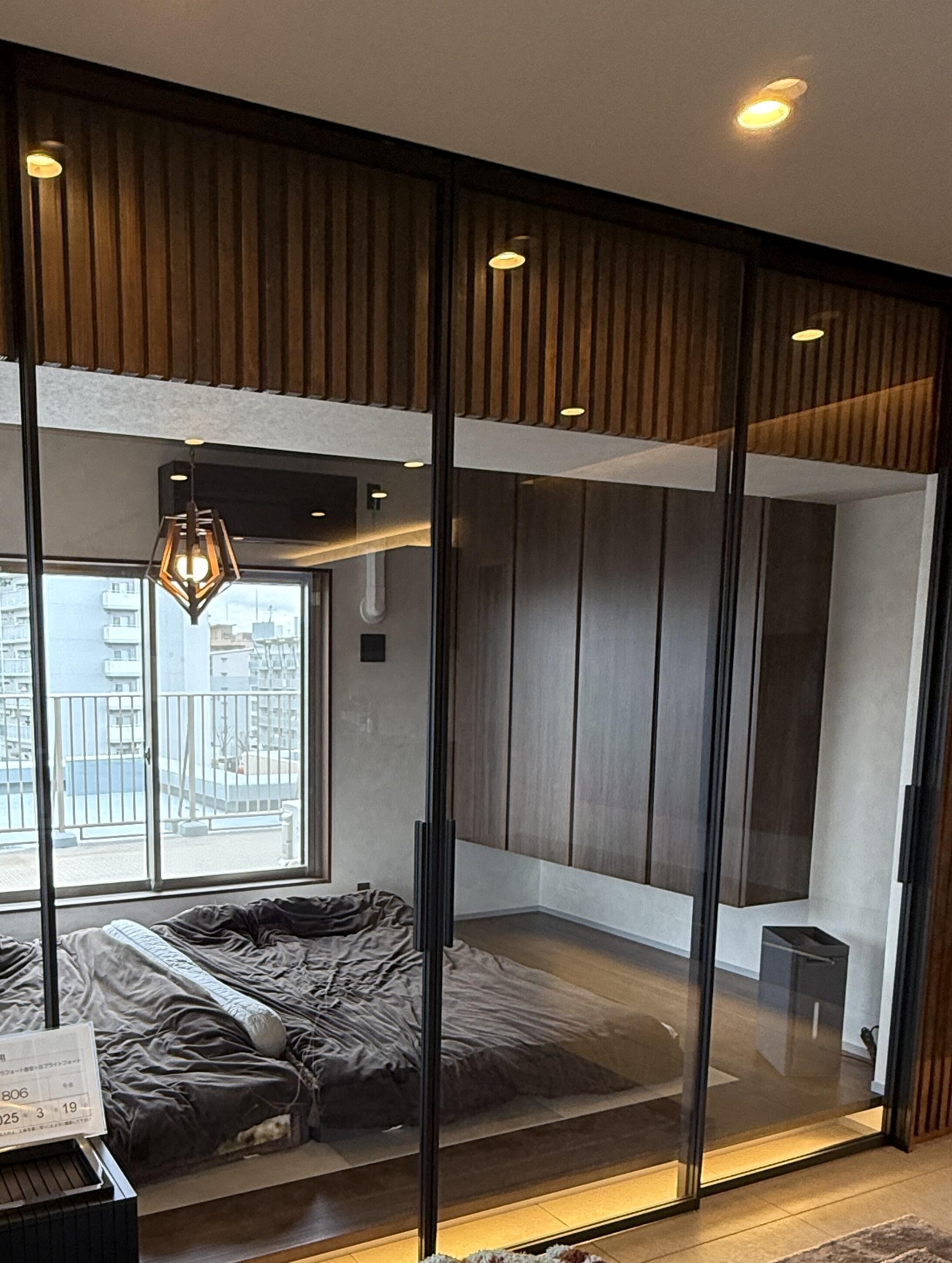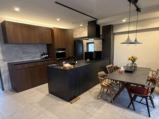 システムキッチン「リシェル」と壁面のエコカラットが調和したシックでモダンなキッチン。 和室の仕切りには天井部までの建具「ラフィス」を使い、上部と右側に木の縦格子を施し、ホテルライクな上質空間に生まれ変わりました。
