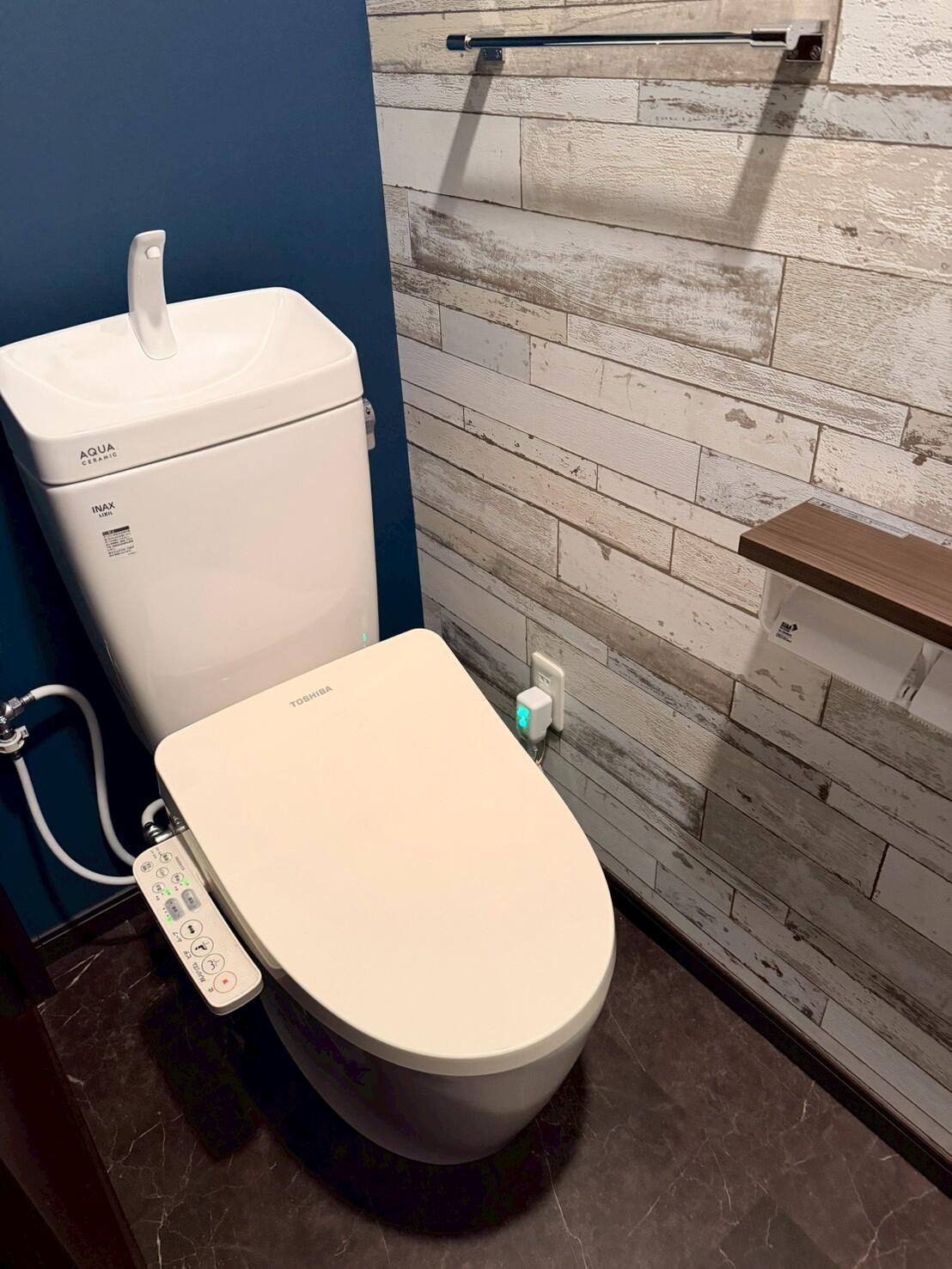 壁紙はネイビーとビンテージ調の木目柄、床は濃いブラウンの石目柄を合わせ、スタイリッシュな印象に。 ペーパーホルダー棚と吊戸棚も床のカラーに合わせることでまとまりのある空間になりました。