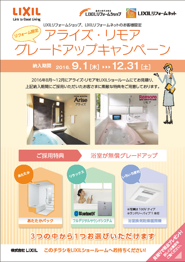 2016年12月までに、下記のチラシをLIXILショールームにご持参の上、ユニットバス『アライズ』、『リモア』のお見積り、
