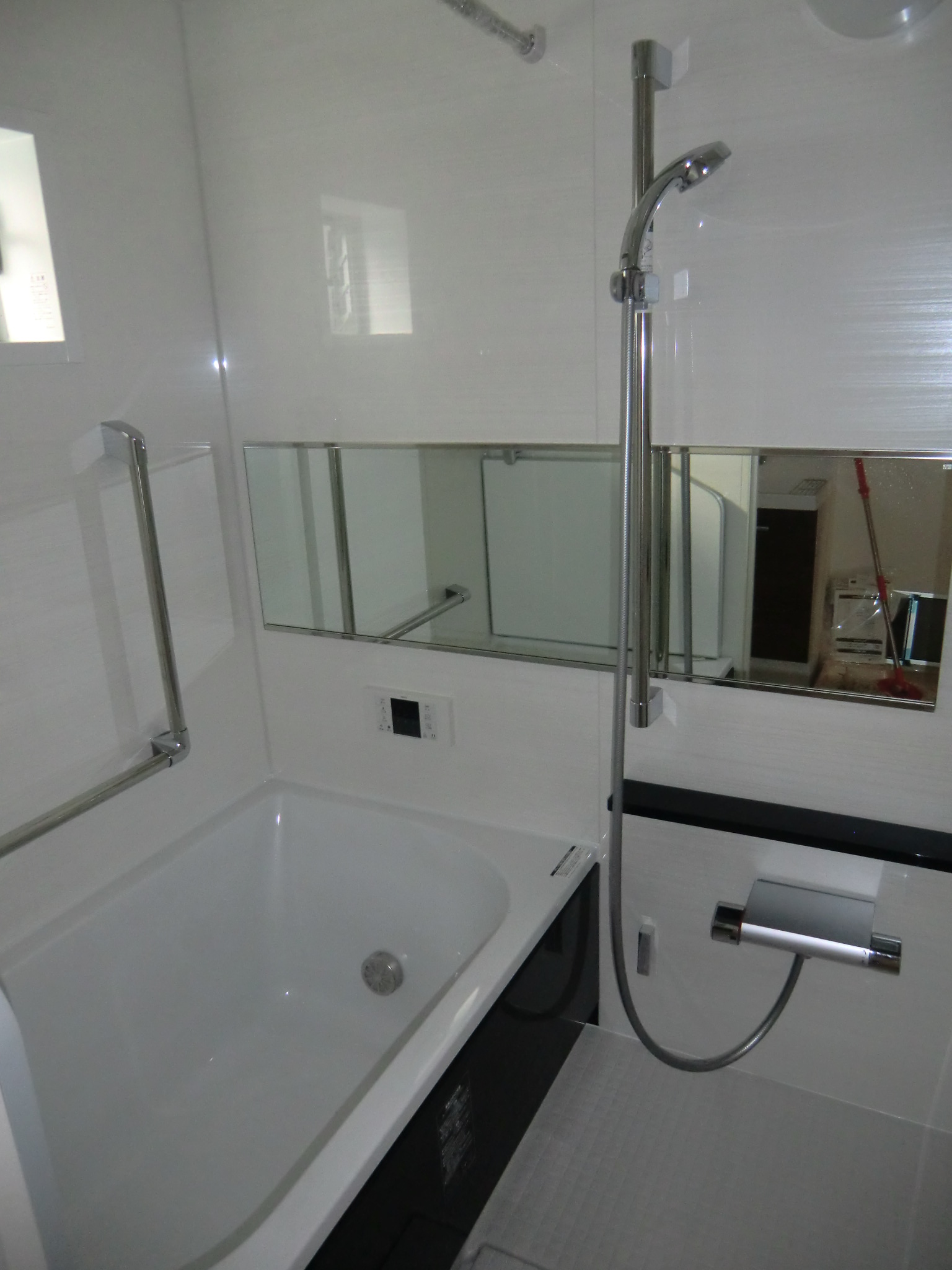 在来の浴槽、床はタイル張りのお風呂でしたが、ユニットバスにされました。将来のことも考え、手すりもつけられました。消防士のご主人も、きれいになったお風呂で、ゆっくり仕事の疲れを取られていることかと思います。