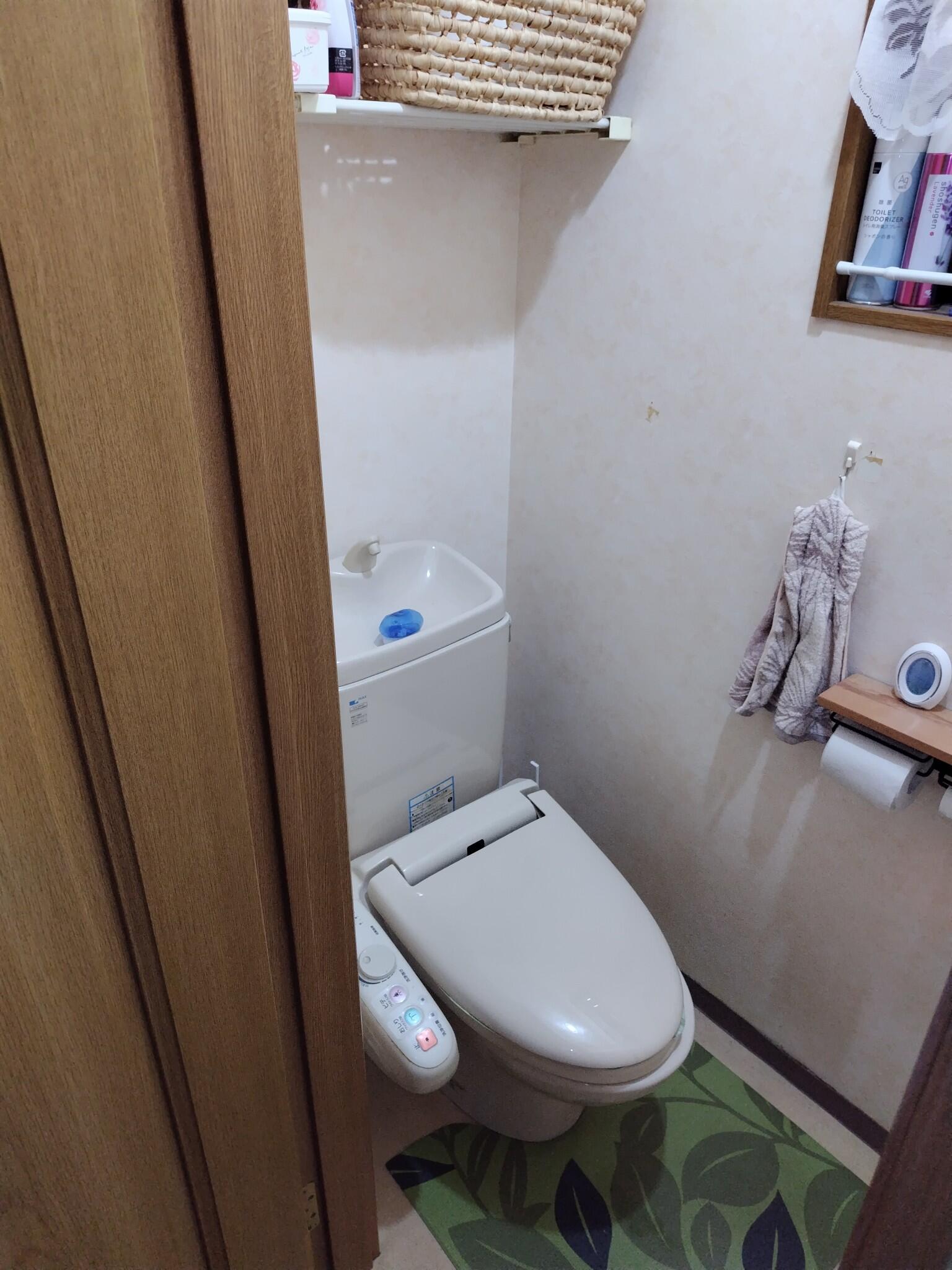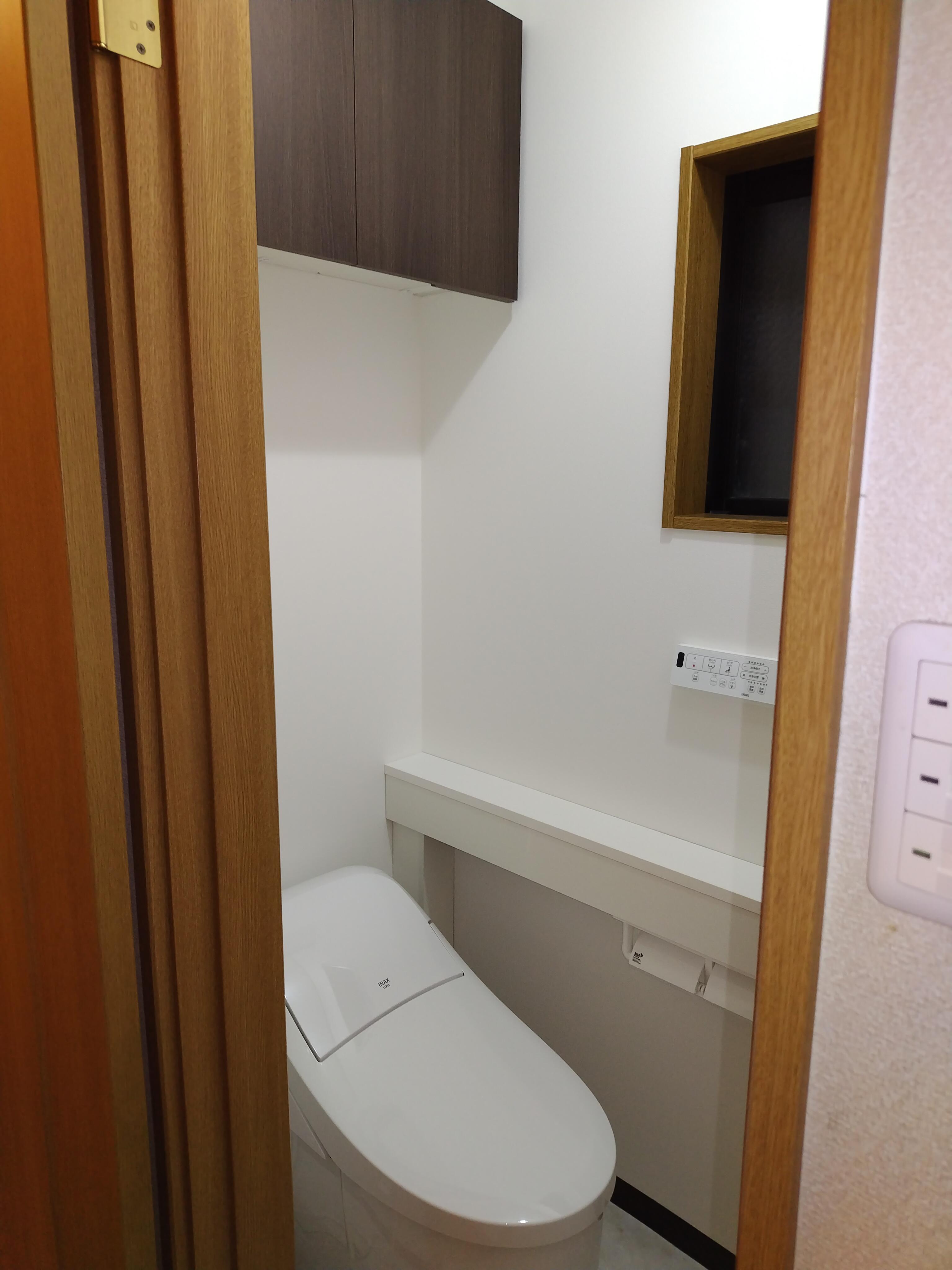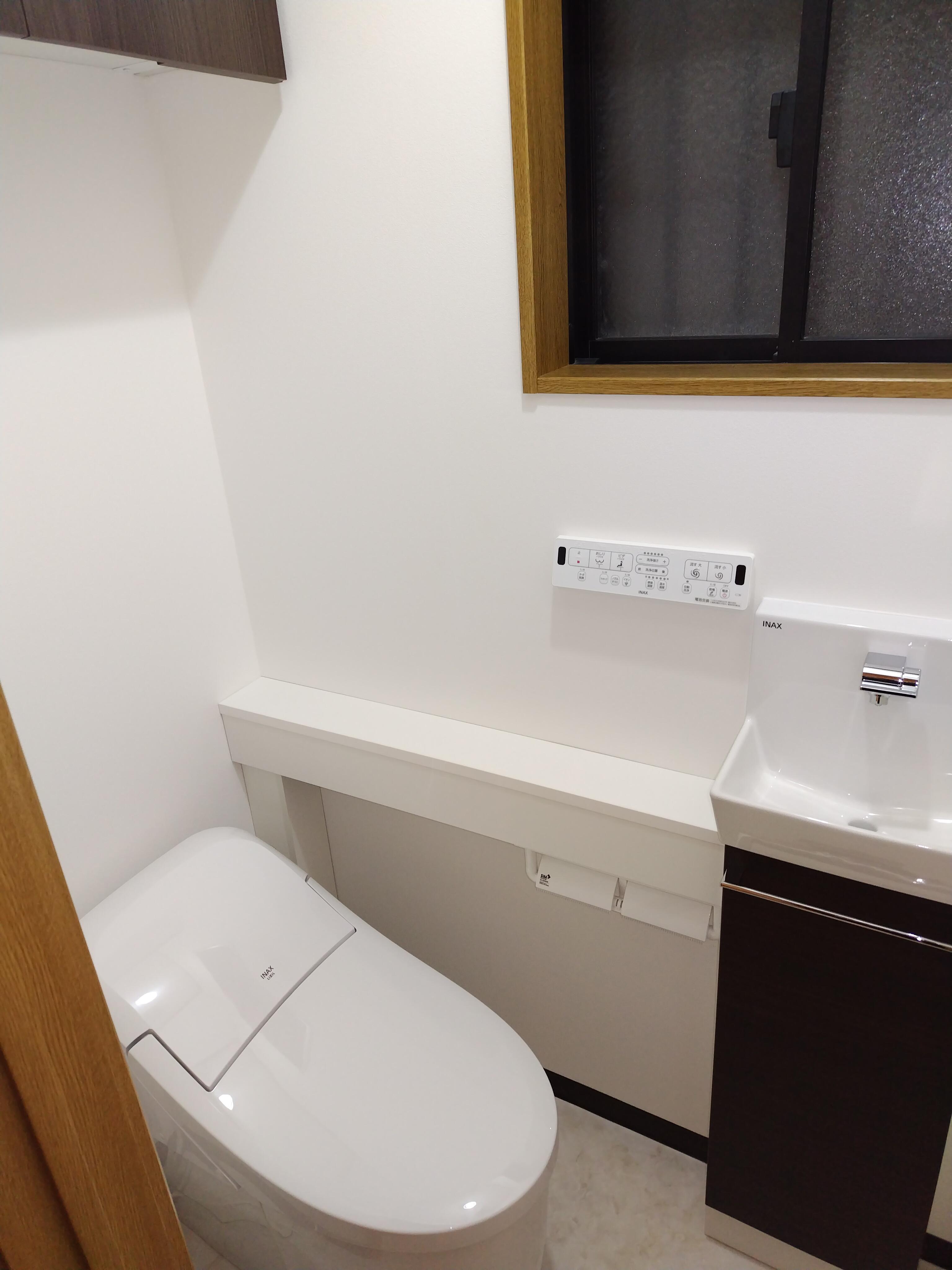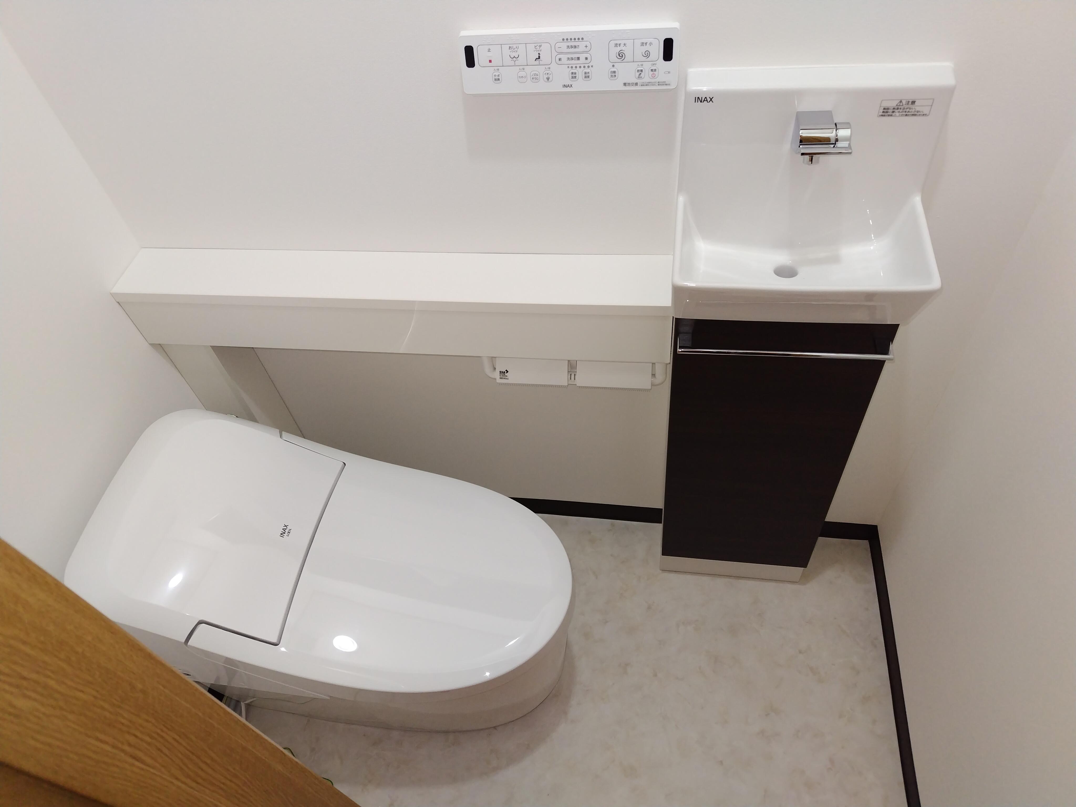 浴室・洗面室・トイレの水回り3点及び内装工事 トイレ 使用商品 LIXIL プレアスLSタイプリトイレ 手洗カウンター付に取替(内装工事含む) 及び アッパーキャビネット取付
