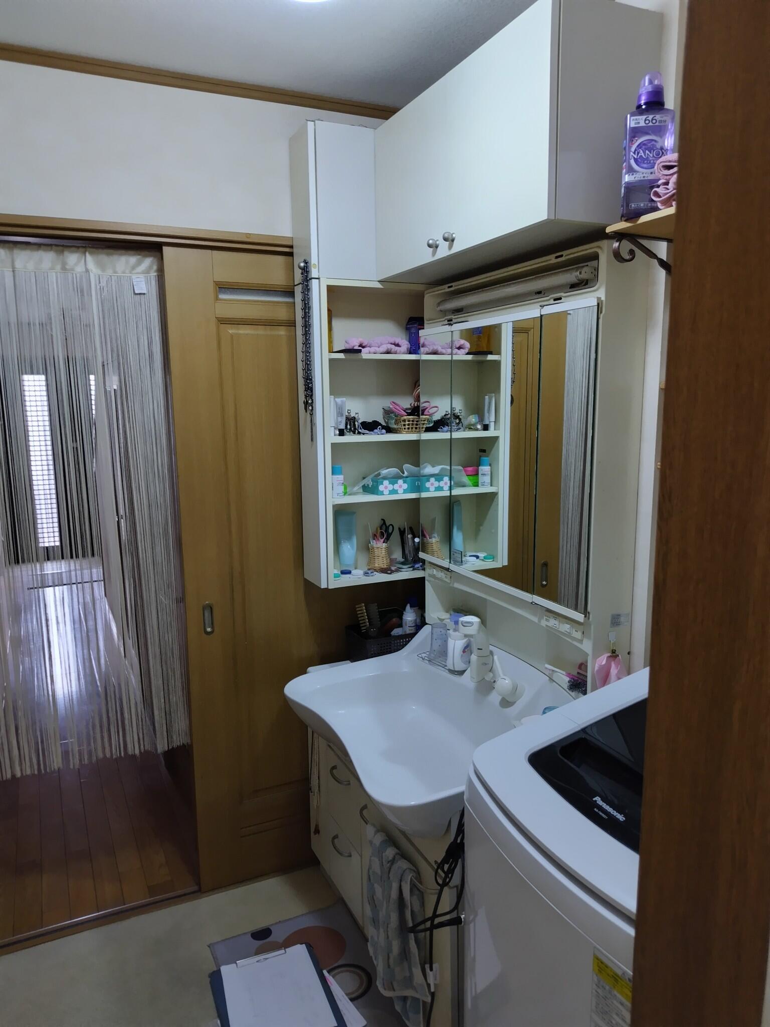 浴室・洗面室・トイレの水回り3点及び内装工事 洗面室 使用商品:LIXIL クレヴィ奥行500タイプ 間口900、タッチレス水栓 アッパーキャビネット(2ヶ所) 及び内装工事