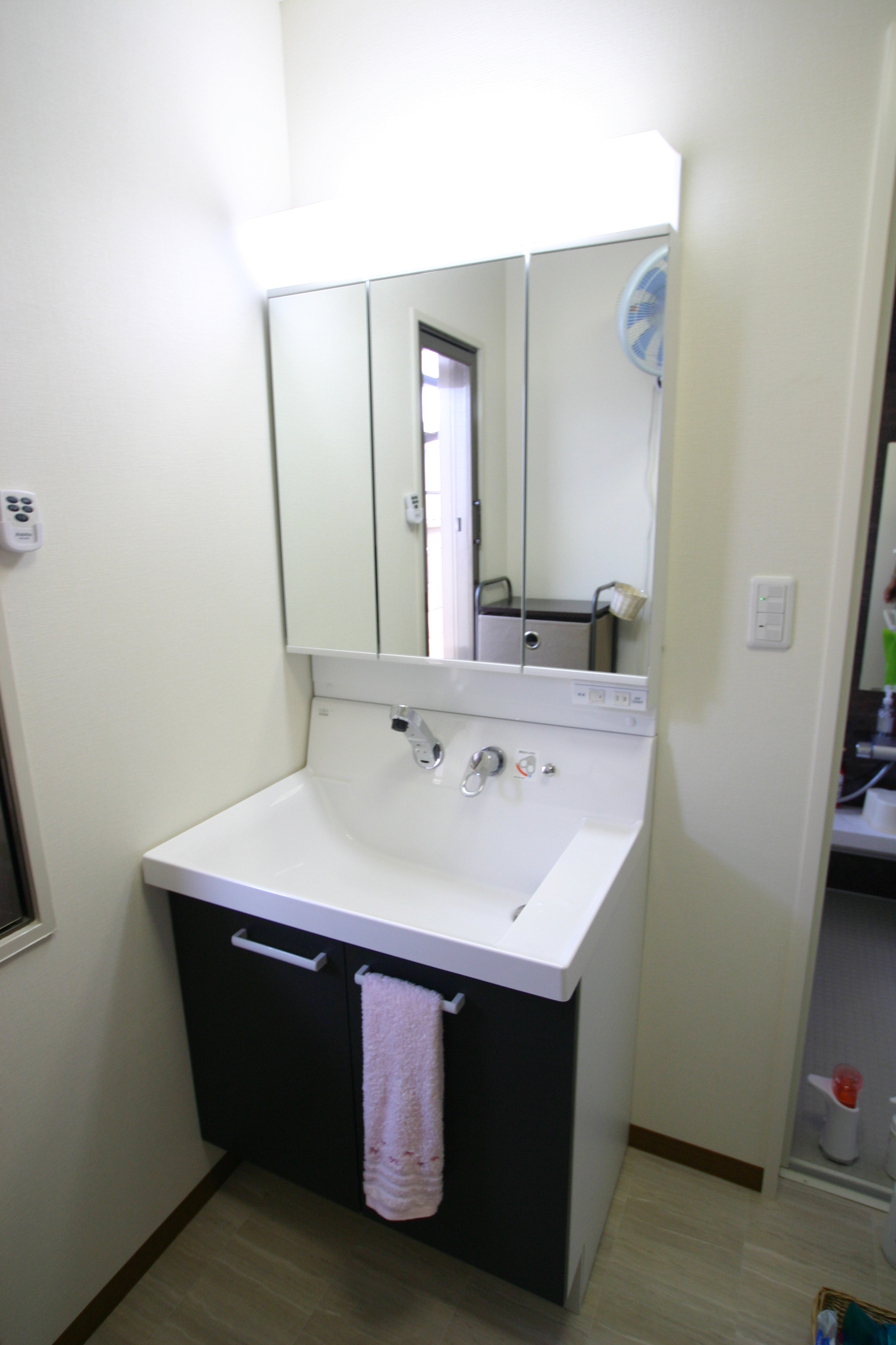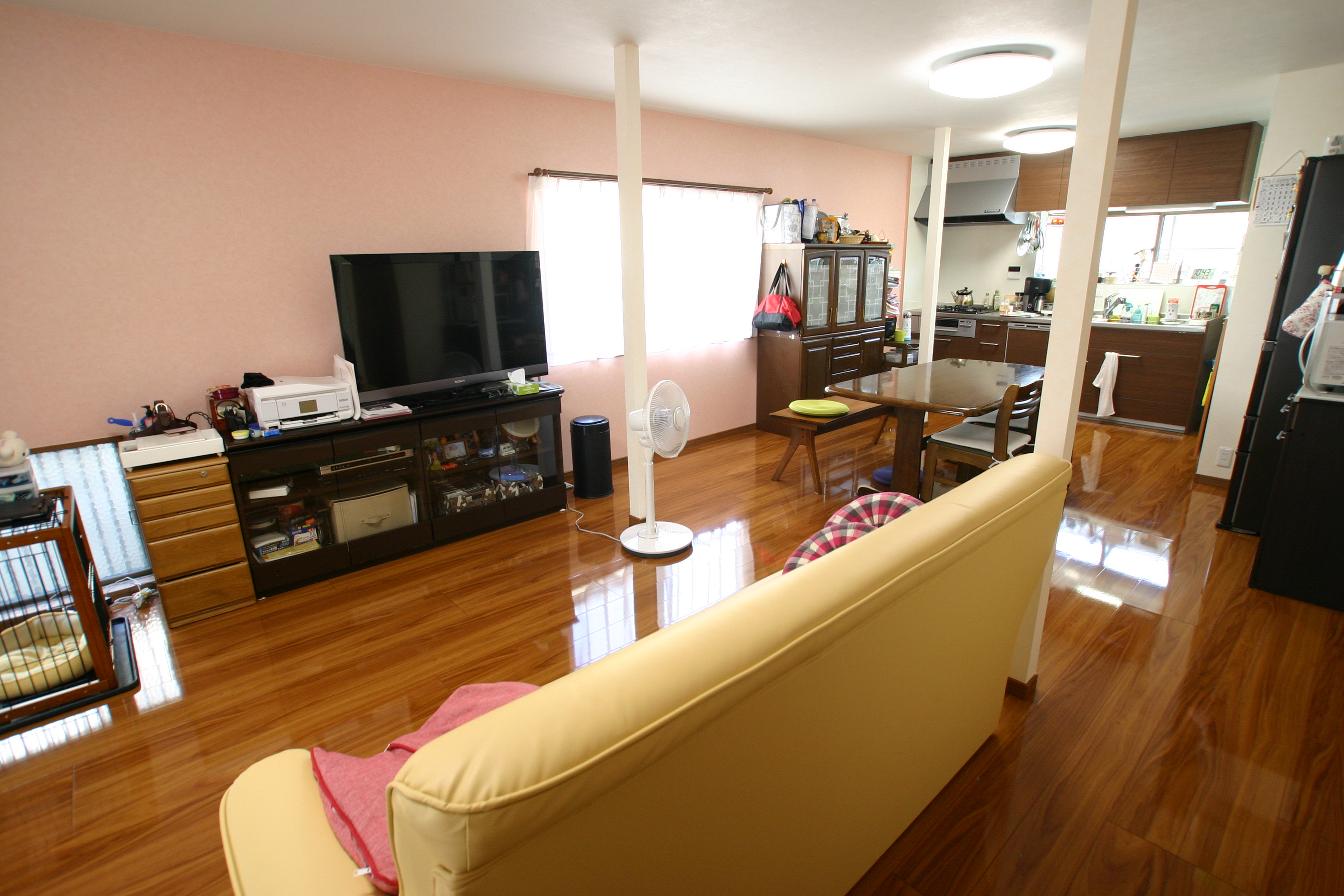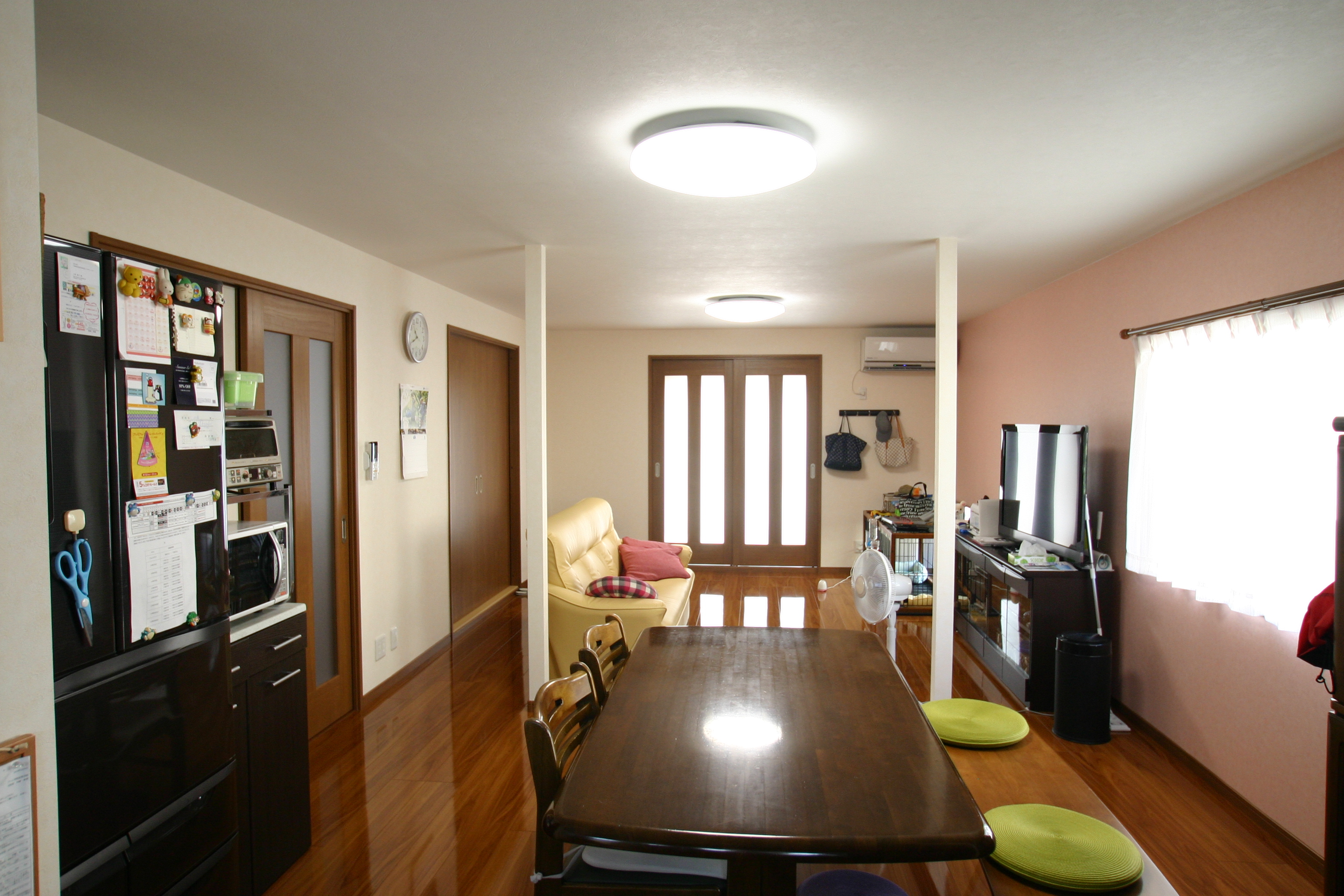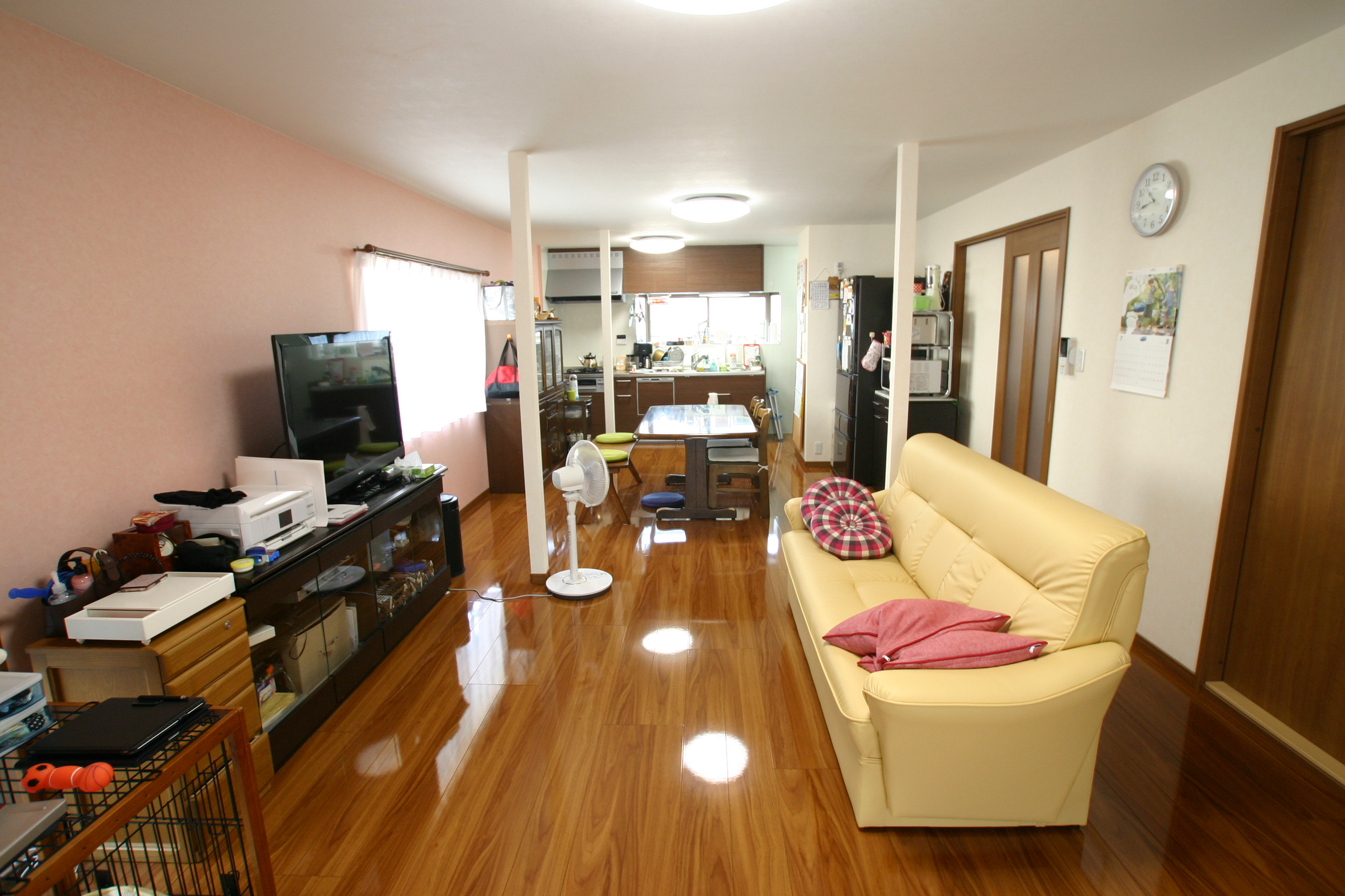 中古住宅を購入されたO様。1階部分の全面リフォームをご相談いただきました。テーマは『ご家族とペットが仲良く暮らす家』。さらに、家事に仕事にと、お忙しい奥様の動線を考えて、プランを検討しました。細かく区切られた間取りでしたので、ワンちゃん2匹が走り回れるような大空間実現のため、また、暗いキッチンに光を取り込み、部屋全体を明るくするため、2間続きの和室の1室を洋室にして、広々としたLDK空間に間取り変更!床材にはワンちゃんにも最適な、すべりにくく丈夫な床材を採用しました。