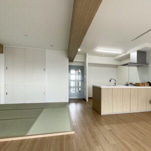 キッチン頭上をオープンにし、和室のふすまを取り払ったことで、