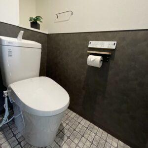 全体的に白と木目調で優しい雰囲気の中、「トイレだけはシックにかっこよくしたい」とF様。