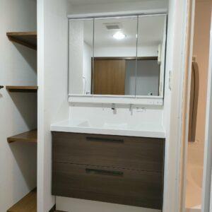 新しい洗面台は引き出しタイプで出し入れしやすく、収納力のあがるものにしました。