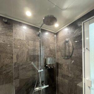 4面すべてを鏡面の組石柄にし、オーバーヘッドシャワーをつけた事で、