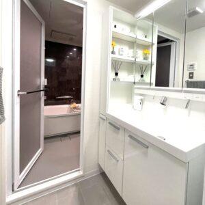 洗面台の色は白にし、極力色数を抑えたので、シックで、お風呂との統一感が生まれています。