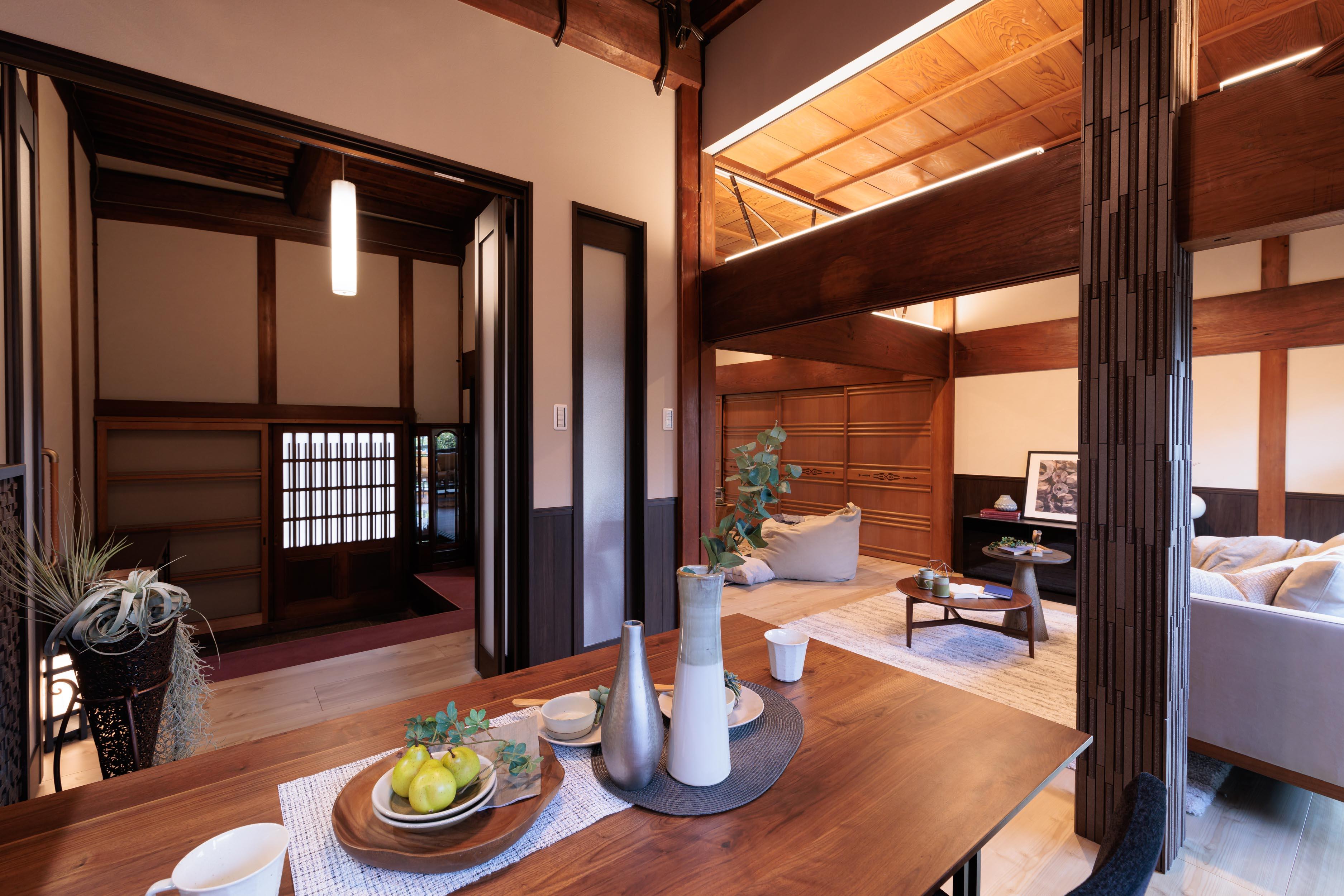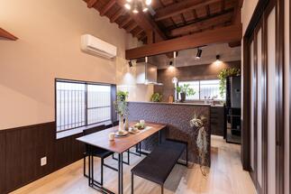 「隠れていた立派な梁を主役に、開放感あふれる住まいにしたい」というN様ご夫妻の願いを形にしました。和室二間と縁側を取り込み、キッチンと一体化させることで、光が隅々まで届く広大なLDKを実現。