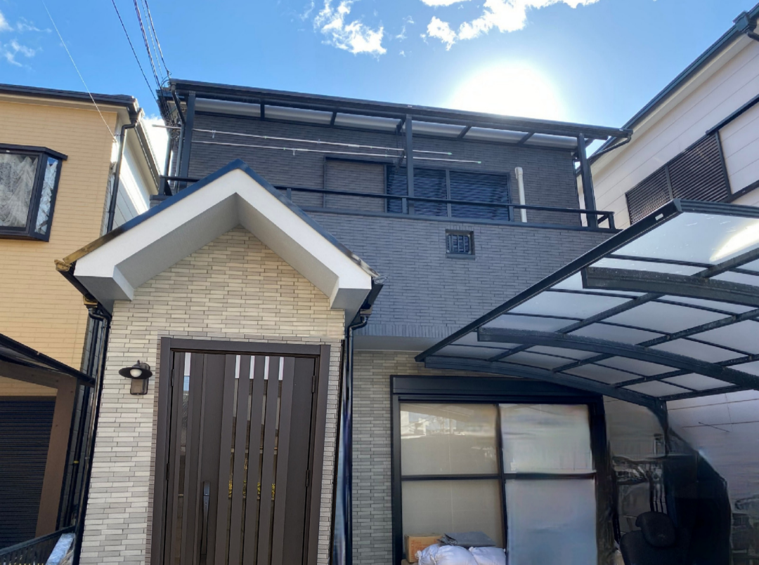 2年ほど前にお家の中と宅配BOXの工事をさせて頂き、今回は外壁・玄関ドア・玄関まわりのリフォームをさせて頂きました。 サイディングからタイルに張替え、1階と2階のタイルを貼り分けました。 玄関のスロープにもタイルを張り、とても高級感のある仕上がりになりました。