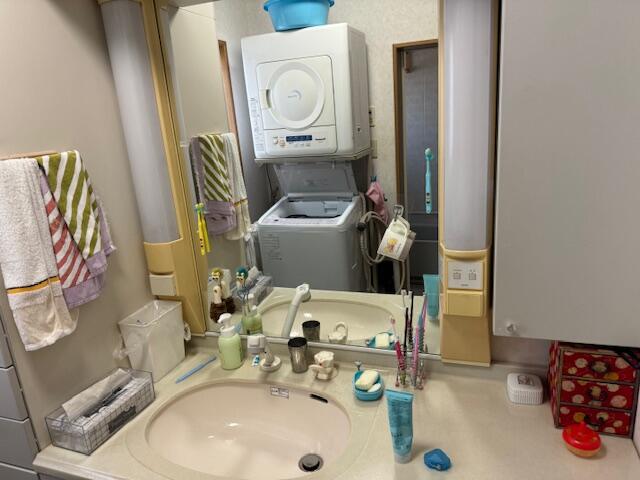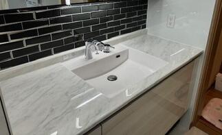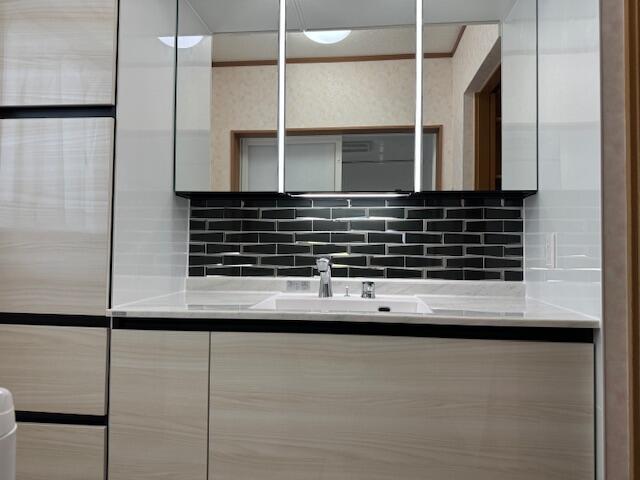 収納力はもちろん、弊社ショ-ル-ムで一目ぼれされたタイルを 洗面台ルミシスと併せさせていただきました。 洗面ボ-ル横はキッチンリシェルのマグネットパネルで水撥ねも安心。 一気にラグジュアリーな空間になりました。