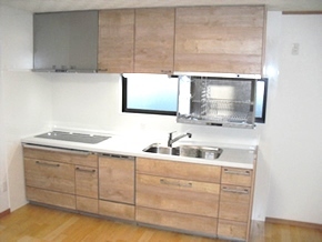 キッチンの改装工事を行いました。 一見すると、普通の壁付キッチンですが、 電動昇降水切り棚、横並びトリプルIHコンロ、 コンロと連動する換気扇など、こだわりの器具がギッシリつまっています。 また、冷蔵庫を置くためにあえてキッチンを小さくして、 使い勝手を向上させました。