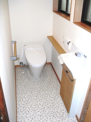 和式のトイレを洋式トイレに改装しました。便器は自動で便フタが開閉するもの、手洗器は自動で水が流れるものを選びました。窓サッシ以外はすべて取り換えたため、まるで新築のように生まれ変わりました。