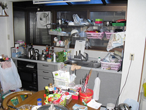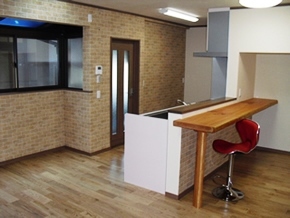 壁付のキッチンを対面キッチンに改装しました。 栗の無垢フローリングと無垢のカウンター材を使用したことで、 とても雰囲気の良いキッチンにリフォームできました。 無垢のカウンター材は、ご主人が買ってこられたものを大工さんにつけてもらいました。 アクセントで奥の壁だけクロスの種類をレンガ調に変えたのも、とてもよい感じに仕上がりました。