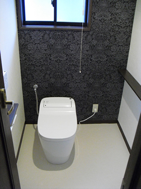 洋式便器をタンクレスに取り替え、内装(壁、床、天井)のやり替えをいたしました。 今回のトイレ便器はパナソニック製のアラウーノを採用しました。 アラウーノはテレビのCMなどでご存知の方も多いと思いますが、 便器に洗剤を入れておけば、水を流すたびに自動で洗ってくれる便器です。 便器ではパナソニックは馴染みが薄いかもしれませんが、 お掃除の回数も減らせるという事で、最近人気の出てきている便器です。 壁は最も一般的な壁紙(クロス)の張り替えを行っただけなのですが、 正面のみ柄の違う壁紙を選ぶことで、グッとおしゃれ