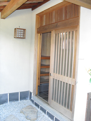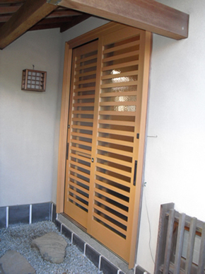 木製の玄関引き戸をアルミ製の玄関引き戸に改装しました。 古い木製の引き戸は隙間が多く、隙間から虫が入ったり風が入ったりしていました。 また、防犯面も少し不安でした。 アルミ製に交換したことにより、これらの問題はすべて解決できました。 玄関引き戸はリフォーム用の製品を使ったため、工事はわずか1日で完成しました。