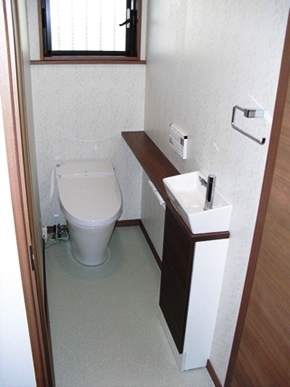 【こだわりポイント】 床のタイルをクッションフロアにして、スリッパ無しでも入れるように。 手洗器が別にある為、便器はタンクレスにしてスペースを確保。 窓サッシも古くて開け閉めしにくかったので、併せて交換しました。 写真には写っていませんが、換気扇が無かったので新設しました。