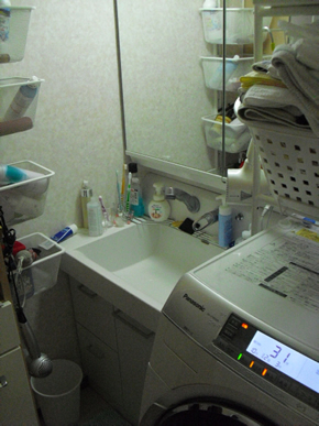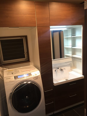 洗面室の改装工事を行いました。工事前は2帖弱の洗面室だったのですが、洗面台と洗濯機だけで場所を取ってしまい、タオルや小物などの収納スペースを取ることが出来ていませんでした。