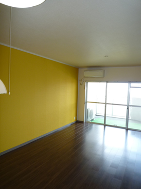 壁クロスはお客様こだわりの色です。壁一面だけ色を変えるのはアクセントになっておしゃれですね♪床はマンションということでクッション材付のフローリングです。マンションの管理規約で床材の防音性能が決められていますので確認してからの施工になります。