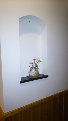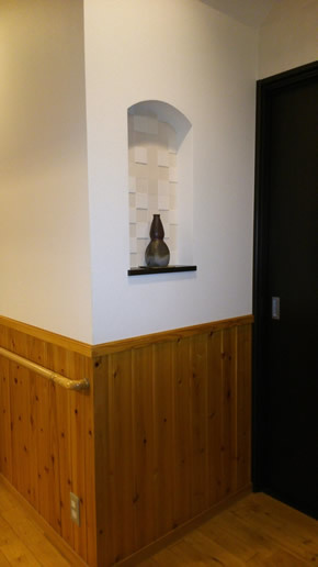 玄関ニッチにエコカラットを施工しました。お花を飾られていましたが背景が変わり一層華やかになりました。エコカラットは脱臭効果があるので玄関のニオイも取ってくれるので玄関には最適です!