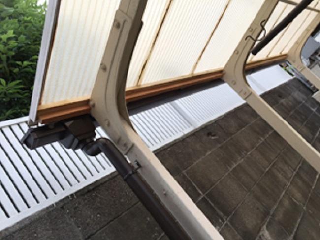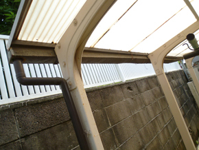 洗濯物干し場として、利用していたのですが長年の雨や泥などの重みで、樋が斜めになり、雨水がぼとぼと。。。樋の下の土が掘れてしまっていました。雨の日は心配で外出できない。と悩まれていました。勾配もつけなおし、よく流れるようになりました。