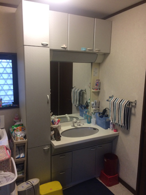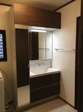 元々大きな洗面台で、とてもきれいに使用されていたのですが、 扉にガタツキがきていたのと、歯ブラシなどの小物がうまく収納できていませんでした。 今回新しくした洗面台。木目の扉が高級感ありますよね。 洗面台本体の扉は引き出しタイプにして効率良く収納できるようになりました。 また、鏡部分は裏に収納できるタイプなので、歯ブラシなどの小物もすべて収納することができます。 照明は今主流になっているLEDになっています。 併せて壁のクロスや床のクッションフロアも張り替えたので、新築のように生まれ変わりました。