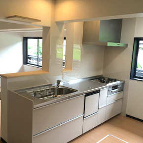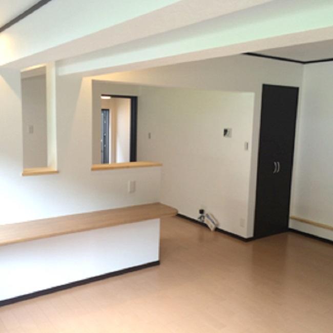 水回りの場所移動を含む間取り変更のため、和室をキッチンに改装しました。 6帖の和室と、隣の8帖の和室を改装しました。 キッチンを新しく設置した前には、抜けない柱があった為、一部壁が残っていますが、できるだけ広く開口部を取りました。 古い梁や柱もすべて新しいクロス壁で綺麗に改装しましたので、どこを見ても古いものが見えず、真新しい明るい部屋になりました。 主に使用されるのはご夫婦お二人なので、ダイニングテーブルは置かずに新設したカウンターテーブルで食事を取っていただき、広く部屋を使っていただけるようにしました。