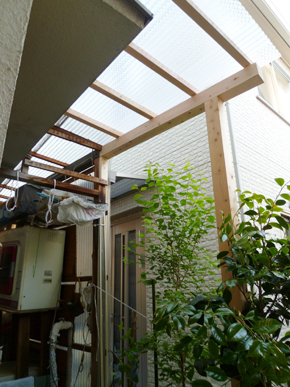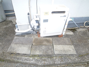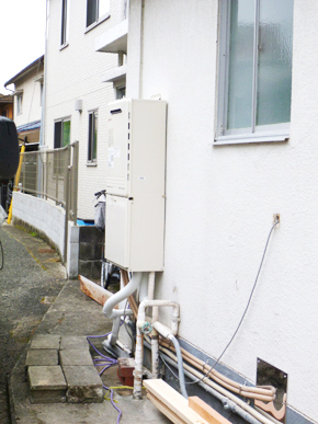写真では分かりにくいですが、とってもかわいらしいお花柄の壁です☆ あわせて給湯器の取替も行いました。また屋外に洗濯機があり、雨の日困るということで、屋根の新設もさせていただきました。