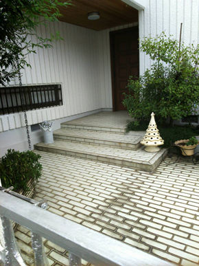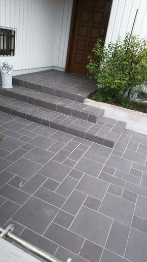 お色をどうされるか見本を玄関で照らしあわされて考えられました。 タイルの並びも単に四角がずら~っと並ぶのではなく、大小様々なタイルを敷くプランを選ばれ、イメージが変わって落ち着いた感じになりました。