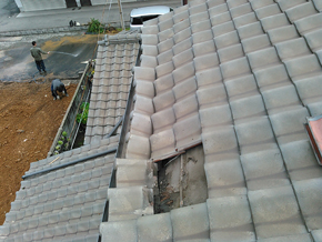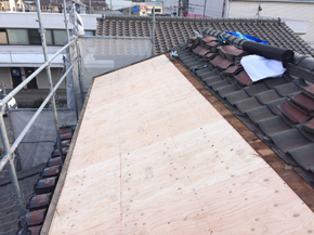 屋根が陥没したということで急遽対応しました。原因は、屋根下垂木のピッチが広く、瓦の重みに耐えられなかったため、 瓦を外し、コンパネを増し張りして耐久性を高めます。最後に瓦を戻して工事完了。葺き替えまでは・・・という方も遠慮なくご相談くださいね!