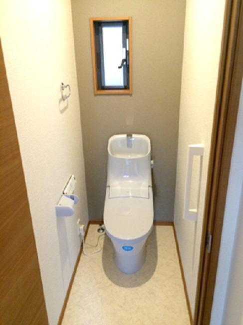 壁、床、天井はすべて解体し、下地からやり替えました。 改装後は、クロス仕上げのきれいなトイレができました。 シンプルなトイレですが、正面の壁クロスだけ色を変える事で良いアクセントになっています。