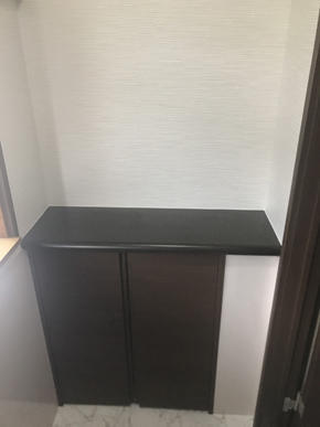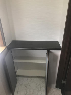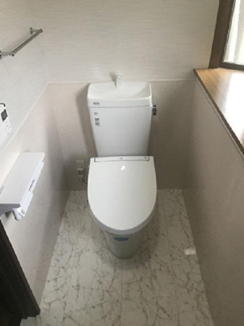 古いトイレは床や腰板に無垢の木材が使われており、和風で、とても雰囲気のあるトイレでした。見た目は良いのですが、無垢の木材はシミや汚れが落ちにくく、掃除のしやすいトイレに、というご希望で改装させていただきました。 床は大理石調のフローリング(防水仕様)、腰壁は掃除のしやすいサニタリーパネルを採用しました。 ここは色々な選択肢があるのですが、掃除のしやすさを最優先しました。換気扇も新調し、便器の反対側の空いたスペースには収納を作りました。 棚板の上には花なども飾っていただけるようになっております。
