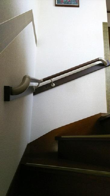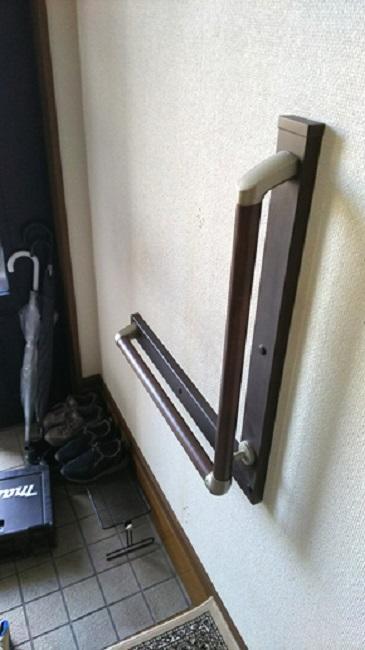 玄関上り口と階段のコーナーに手摺を取り付けさせて頂きました。玄関を手摺を掴んで上がっても後ろ手にならないように位置を確認しながら取り付けました。階段は降りる時に左側にすでに手摺があったのでコーナー部分だけの取り付けです。