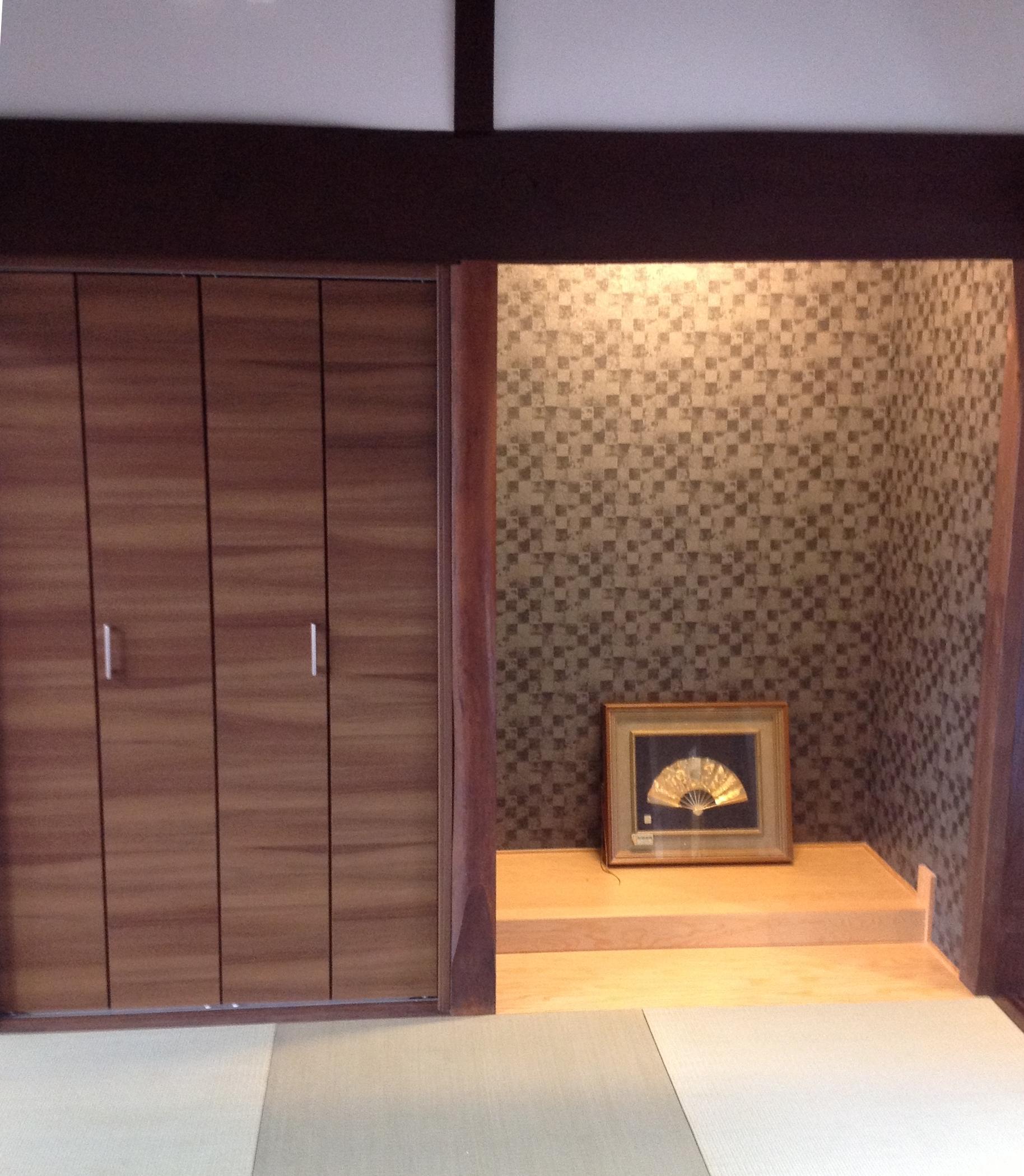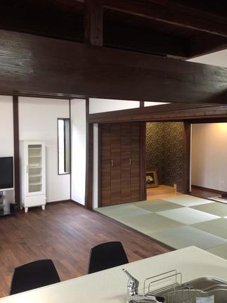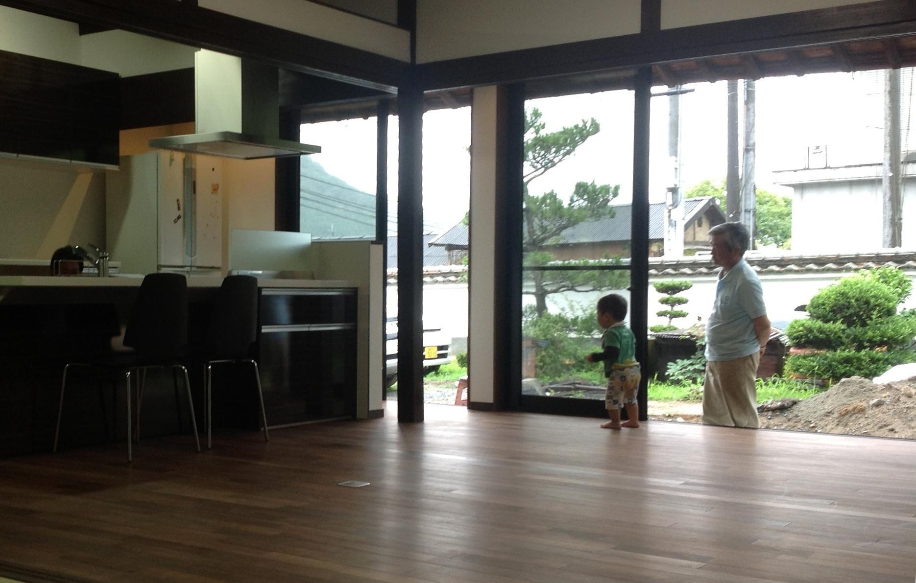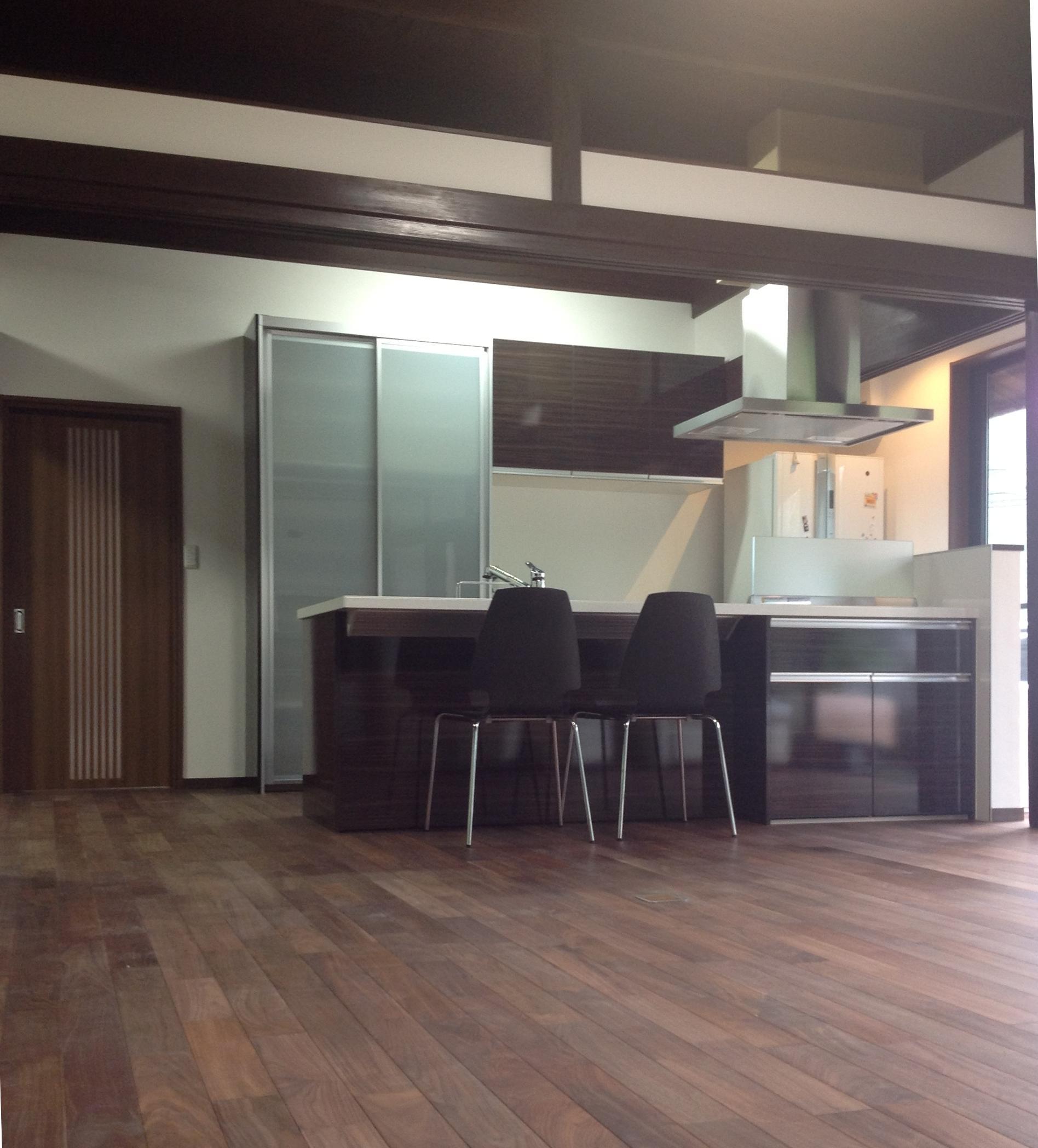 ご主人こだわりの無垢フローリング!壁は漆喰で仕上げ古民家の良さを残しつつも、モダンな空間へ!居室・廊下・玄関ホールとすべてに段差があったのですが、改装後はフロアを下げて調整することにより、段差を解消建具も大きくなりました。LDKには、3間の掃出窓を設け日当たりもばっちりです。