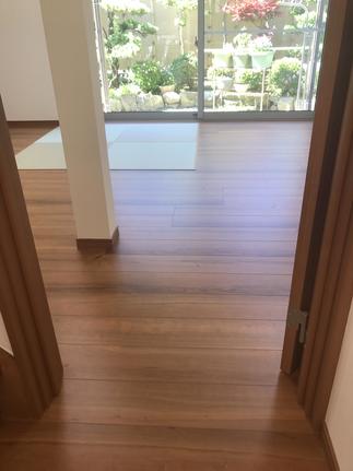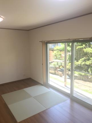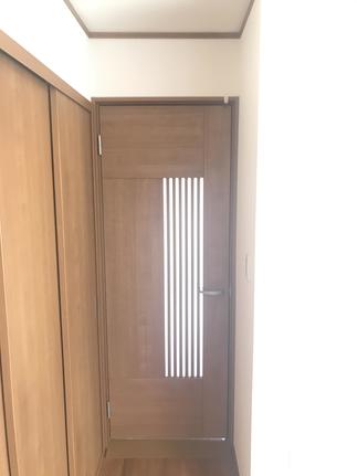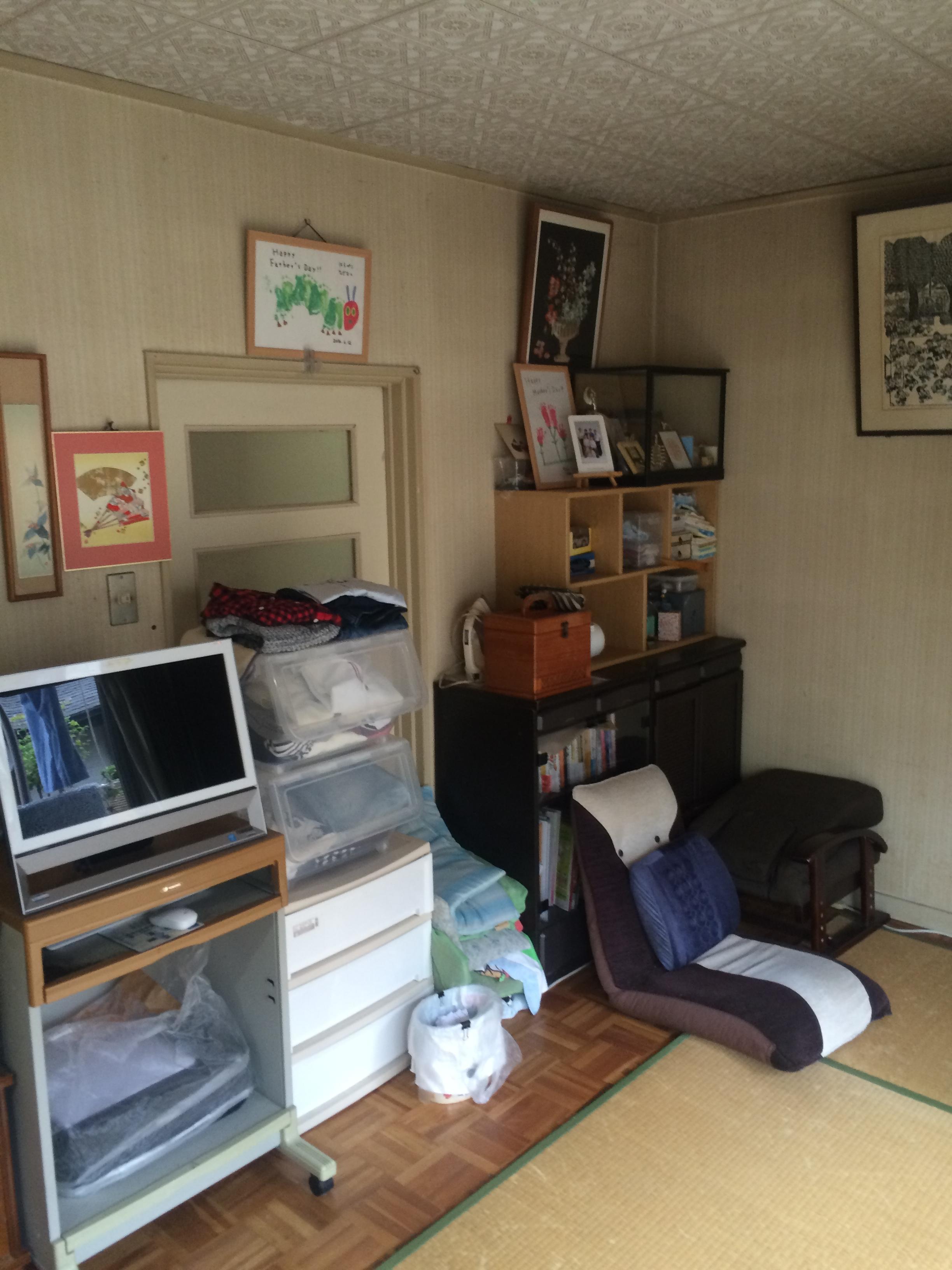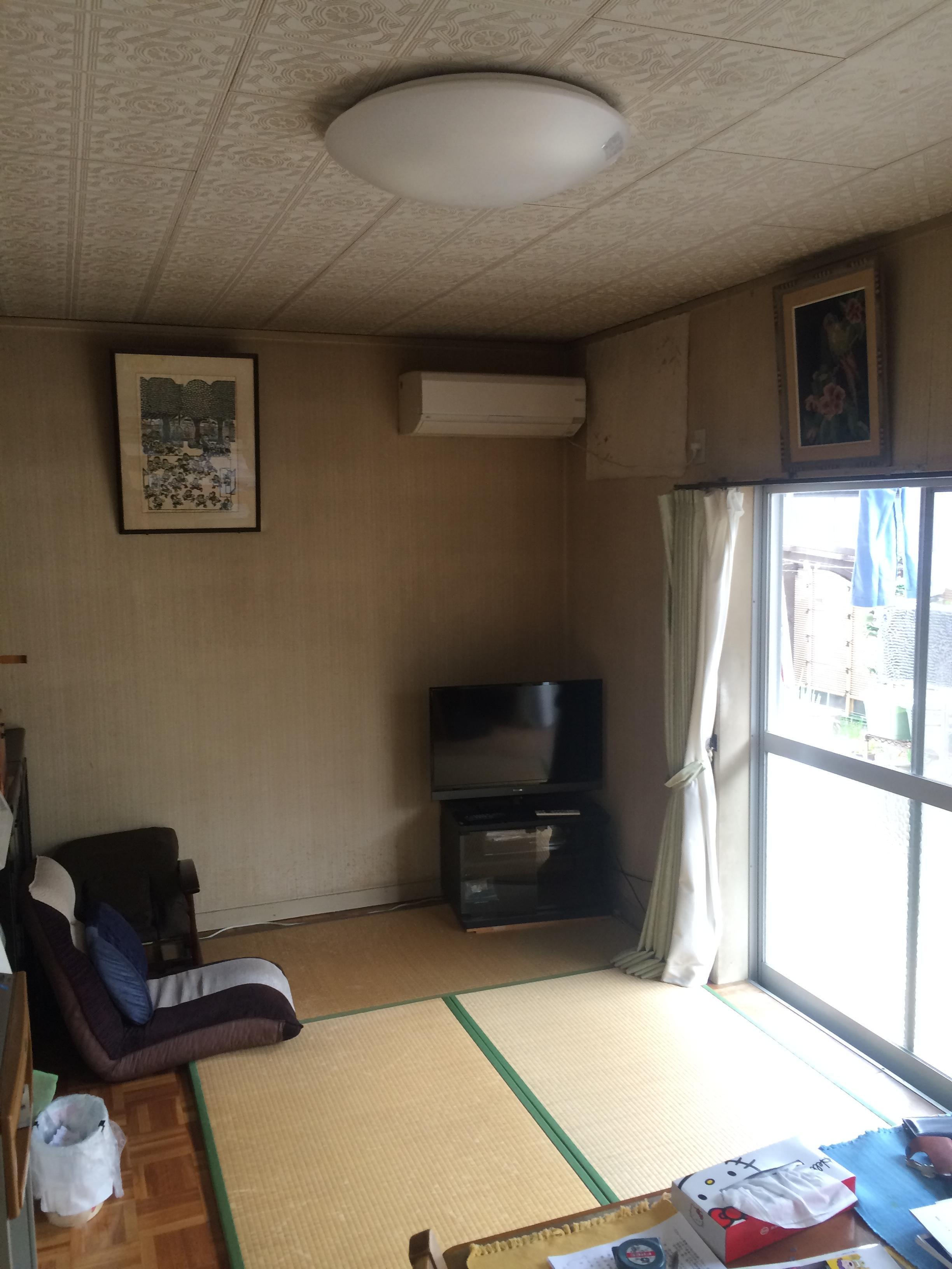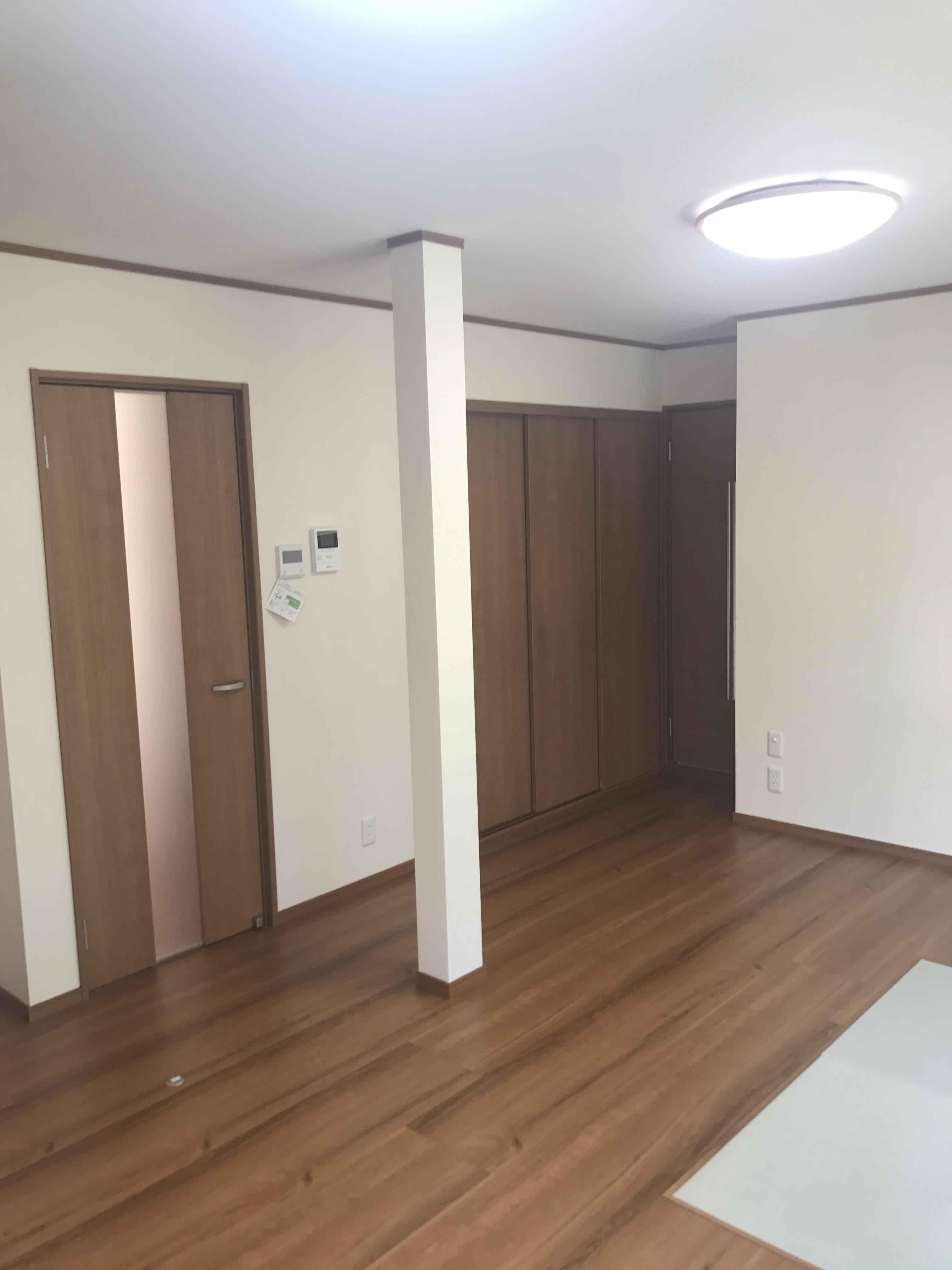工事前のリビング部分は6畳で、もう少し広さが欲しい所です。 パソコン置いているドアの向こうは、和室につながる廊下でした。 この隣の和室を取り込んで、12畳のリビングにするご提案もしたのですが、将来的にはこの和室を寝室にする予定なので、リビングに取り込む案は没になりました。 最終プランでは、この奥の廊下2畳分をリビングに取り込むことで決定しました。 たった2畳ですが、かなりゆったりした雰囲気になりました。 テレビを見る所は、ご主人が横になれるようにバリアフリーの畳スペースにしています。 また、廊下との間の壁を撤去したのですが、柱は一本残しています。 窓サッシやガラス入りのドアも新調し、全体的な雰囲気もかなり明るくなりました。 元々廊下にあった収納戸も三枚引き戸に変更し、和室へのドアも新調しました。 廊下からリビングに入るドアも新調し、床はバリアフリー仕様にしています。 動線も良くなり、お客様にも大満足していただけました。